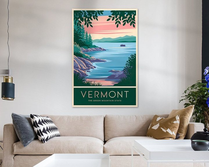 Sanfte Pastelltöne verschmelzen mit der Ruhe eines idyllischen Wassers, während die umrissenen Berge im Hintergrund eine träumerische Atmosphäre schaffen. Dieses kunstvolle Vermont-Motiv fängt die Essenz von Natur und Freiheit ein und verleiht jedem Raum eine entspannende Note. Ideal für das Wohnzimmer, um jeden Tag eine Auszeit in die eigene Oase zu bringen.