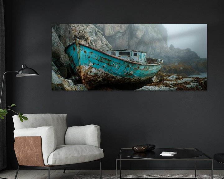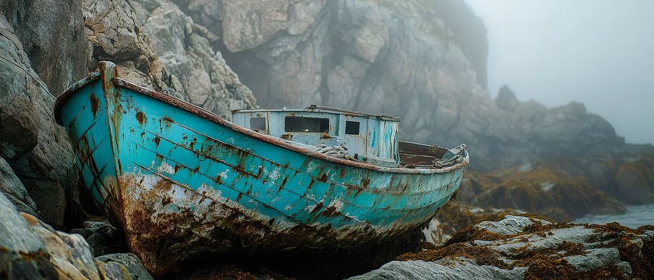 Erhältlich mit oder ohne Passepartout für eine stilvolle Präsentation von Verrostetes Boot am Felsen – Nebelstimmung Kunstwerken.