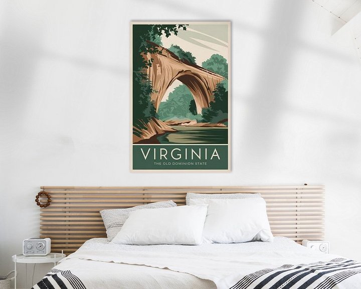 Ein majestätischer Brückenbogen erhebt sich über sanfte Gewässer, umrahmt von üppigem Grün und einer harmonischen Farbpalette in beruhigenden Erdtönen. Dieses kunstvolle Werk verkörpert die natürliche Schönheit Virginias und bringt eine erfrischende, entspannende Atmosphäre ins Wohnzimmer oder Büro, perfekt für Naturliebhaber und kreative Köpfe.