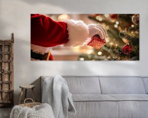 Sanfte Lichter funkeln durch den plüschigen Weihnachtsbaum, während eine Hand, gehüllt in festlichen Stoff, ein liebevoll verpacktes Geschenk an die Äste hängt. Diese Szene versprüht ein Gefühl von Magie und Vorfreude. Perfekt für das Wohnzimmer, wo sie die festliche Stimmung und den Zauber der Feiertage noch verstärkt.
