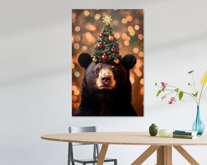 Ein fröhlicher Bär mit einem festlichen Weihnachtsbaum auf dem Kopf strahlt Gemütlichkeit und den Zauber der Feiertage aus. Umgeben von funkelnden Lichtern, bringt dieses charmante Bild eine spielerische Note sowie Wärme in jedes Wohnzimmer. Ideal für eine festliche Atmosphäre, die zum Schmunzeln und Verweilen einlädt.