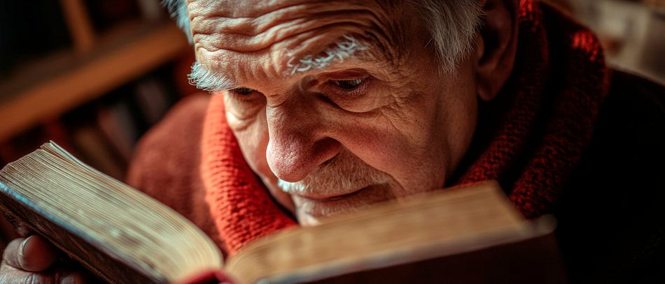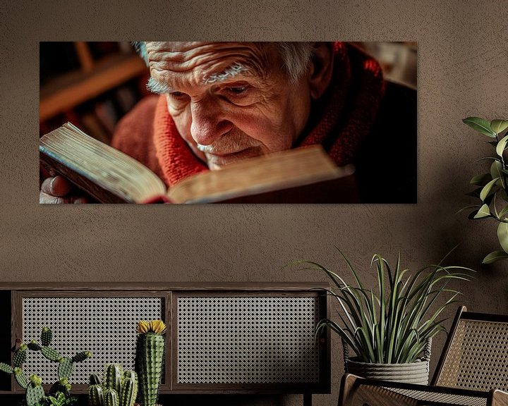 In der warmen Lichtstimmung eines gemütlichen Raumes sitzt ein älterer Herr, tief in seinen Gedanken verloren, während er ein altes Buch studiert. Seine raue Gesichtszüge erzählen Geschichten aus der Vergangenheit, und der dicht gewickelte Schal verleiht ihm eine wohltuende Wärme. Dieses Bild bringt eine inspirierende, nachdenkliche Atmosphäre und ist perfekt für ein Wohnzimmer oder ein Lesezimmer.