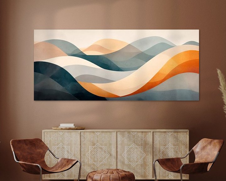 Sanfte Wellenformen in harmonischen Farbnuancen von Beige, Blau und Orange verleihen diesem Kunstwerk eine beruhigende Eleganz. Die fließenden Linien vermitteln ein Gefühl von Bewegung und Freiheit, ideal, um in einem Wohnzimmer Ruhe und Inspiration zu schaffen. Diese Komposition lädt immer wieder zum Träumen ein und harmoniert perfekt mit modernen Einrichtungsstilen.