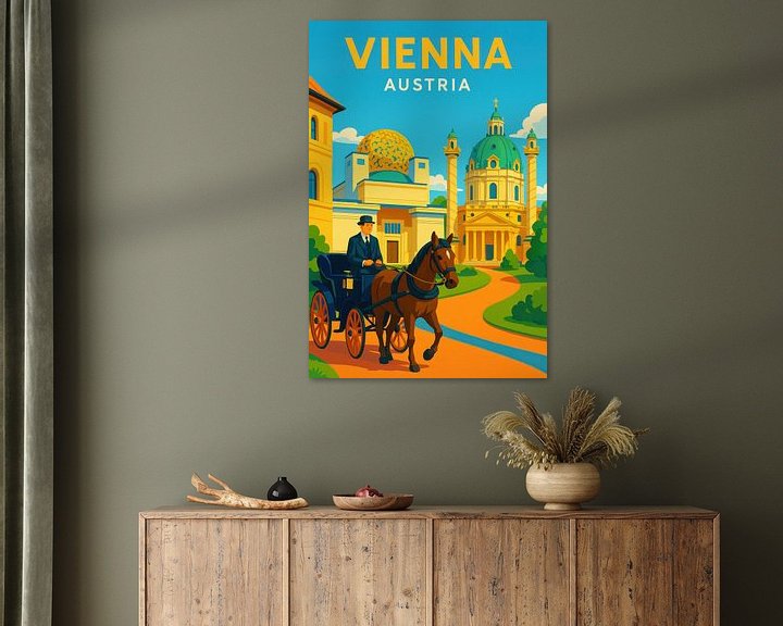 In einem lebhaften, farbenfrohen Wien schlendert eine stilvolle Pferdekutsche durch majestätische Architektur. Die prächtigen Kuppeln und Türme strahlen eine zeitlose Eleganz aus, während der klarblaue Himmel die Szene perfekt abrundet. Dieses Kunstwerk verleiht dem Wohnzimmer oder Büro eine nostalgische Note und lädt zum Träumen von Reisen und Abenteuern ein.