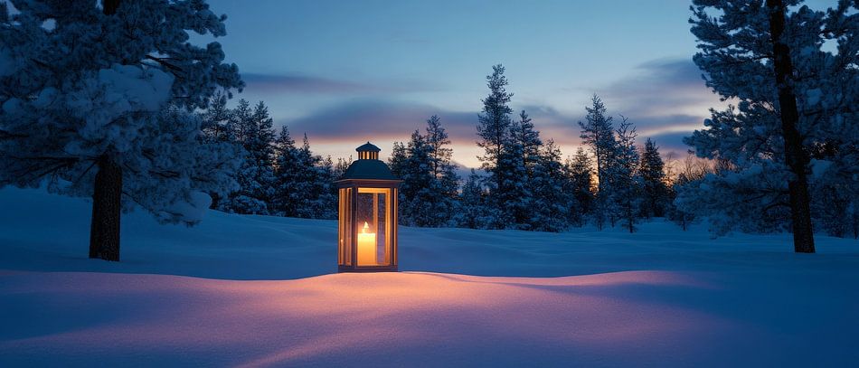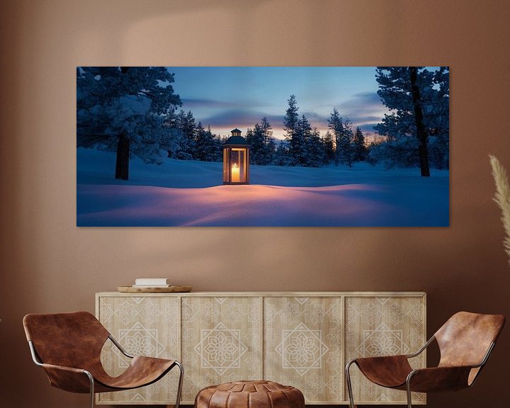 In einer winterlichen Traumlandschaft erleuchtet eine einsame Laterne sanft den Schnee, während der Himmel in stimmungsvolles Dämmerlicht getaucht ist. Die schneebedeckten Bäume umrahmen diese zauberhafte Szenerie und schaffen eine Atmosphäre von Ruhe und Geborgenheit. Perfekt für ein Wohnzimmer, wo sie Gemütlichkeit und Winterzauber versprüht.