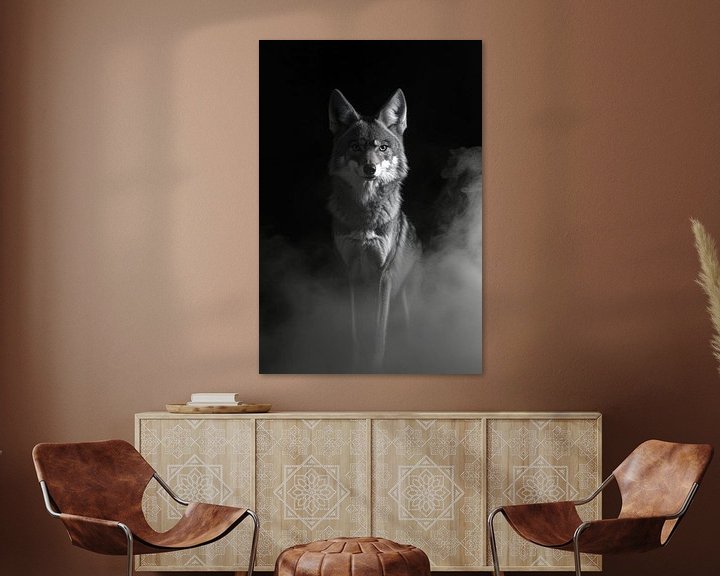 Ein majestätischer Wolf, umhüllt von geheimnisvollem Nebel, erweckt den Eindruck von Stärke und Anmut. Seine scharfen Augen strahlen Intelligenz und Wilderness aus, während der monochrome Kontrast eine dramatische Atmosphäre schafft. Ideal für ein Wohnzimmer, bringt dieses Kunstwerk eine faszinierende Präsenz und einen Hauch von Natur ins moderne Heim.