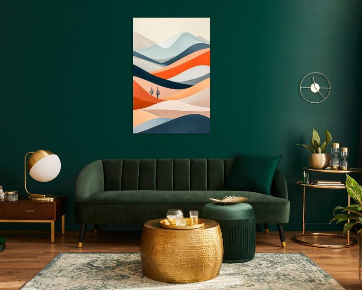 Sanfte Wellen und harmonische Farbtöne in warmen Erdtönen kreieren eine Ruhe, die zum Träumen einlädt. Die stilisierten Konturen der Berge und einsamen Kakteen verleihen dem Artwork eine faszinierende Tiefe. Ideal für das Wohnzimmer, um eine entspannte Atmosphäre zu schaffen und die Fantasie zu beflügeln.