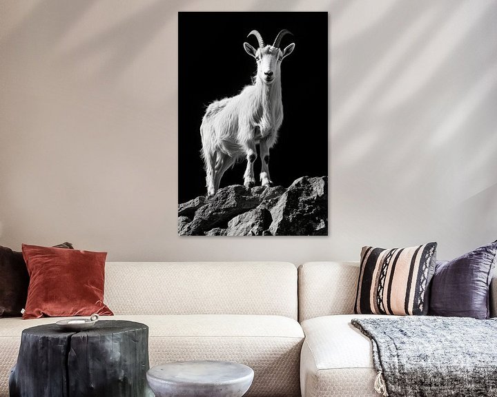 In kraftvollem Kontrast präsentiert sich die majestätische Ziegenfigur auf einem Felsen, umgeben von tiefem Schwarz. Ihr eindringlicher Blick und das flauschige, weiße Fell verleihen ihr eine beinahe mystische Aura. Dieses Kunstwerk ist perfekt für das Wohnzimmer, wo es seine Betrachter zum Staunen einlädt und eine entspannte, natürliche Atmosphäre schafft.