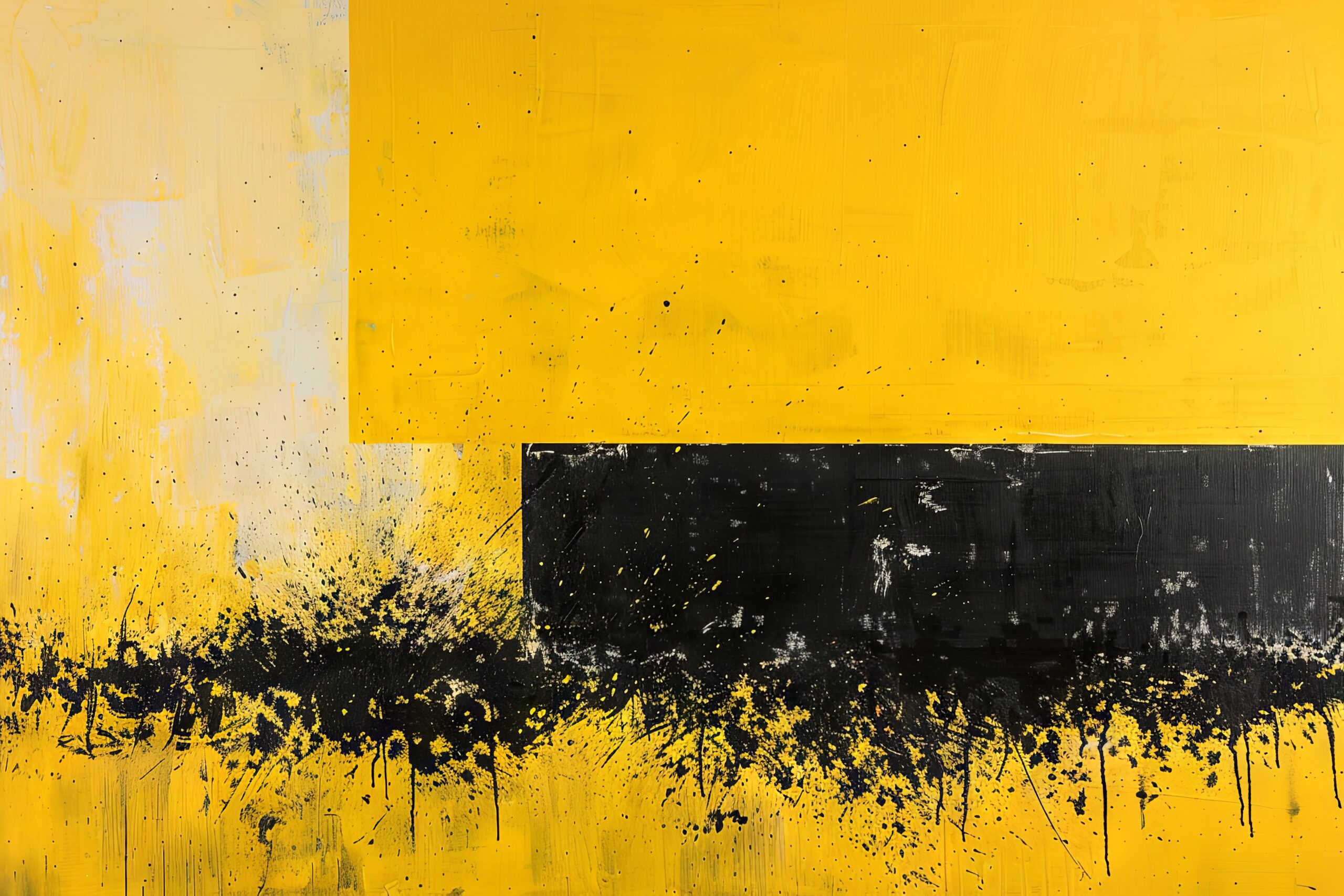 Flächiges Bild mit intensiven Gelb. Unregelmäßige schwarze Spritzer und Linien quer in der Bildmitte. Kraftvolle Geometrie.