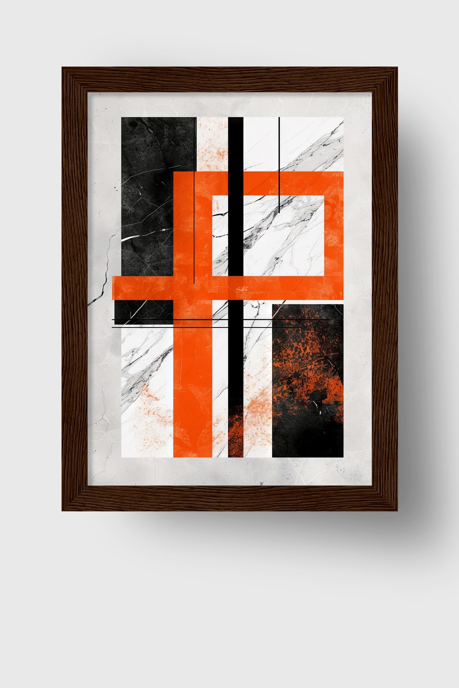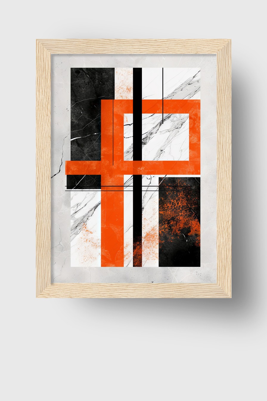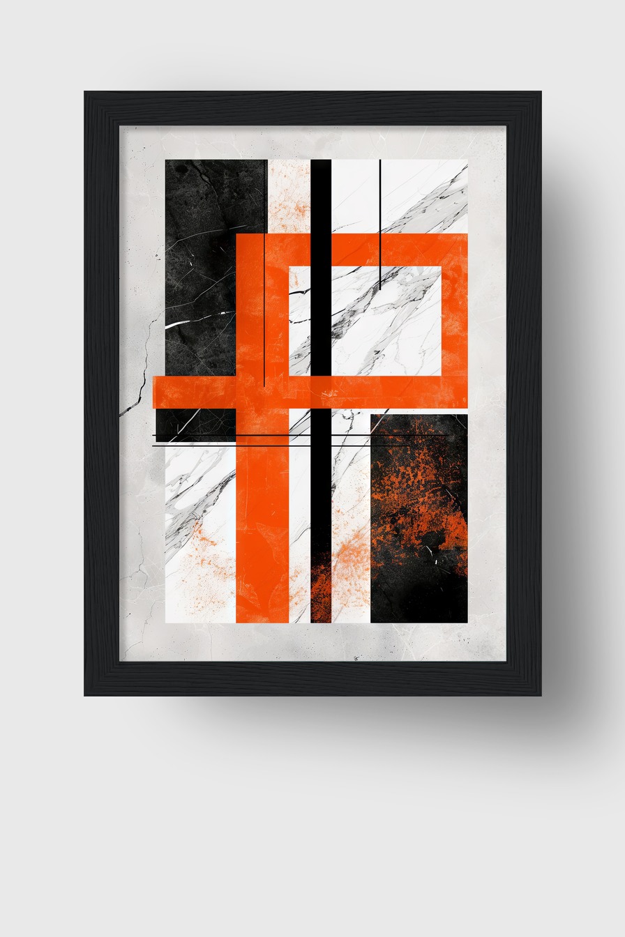 Die Kombination aus orangen Rechtecken und schwarzen Linien hebt sich klar von der hellen Marmortextur ab und prägt den Raum mit klarer Struktur.