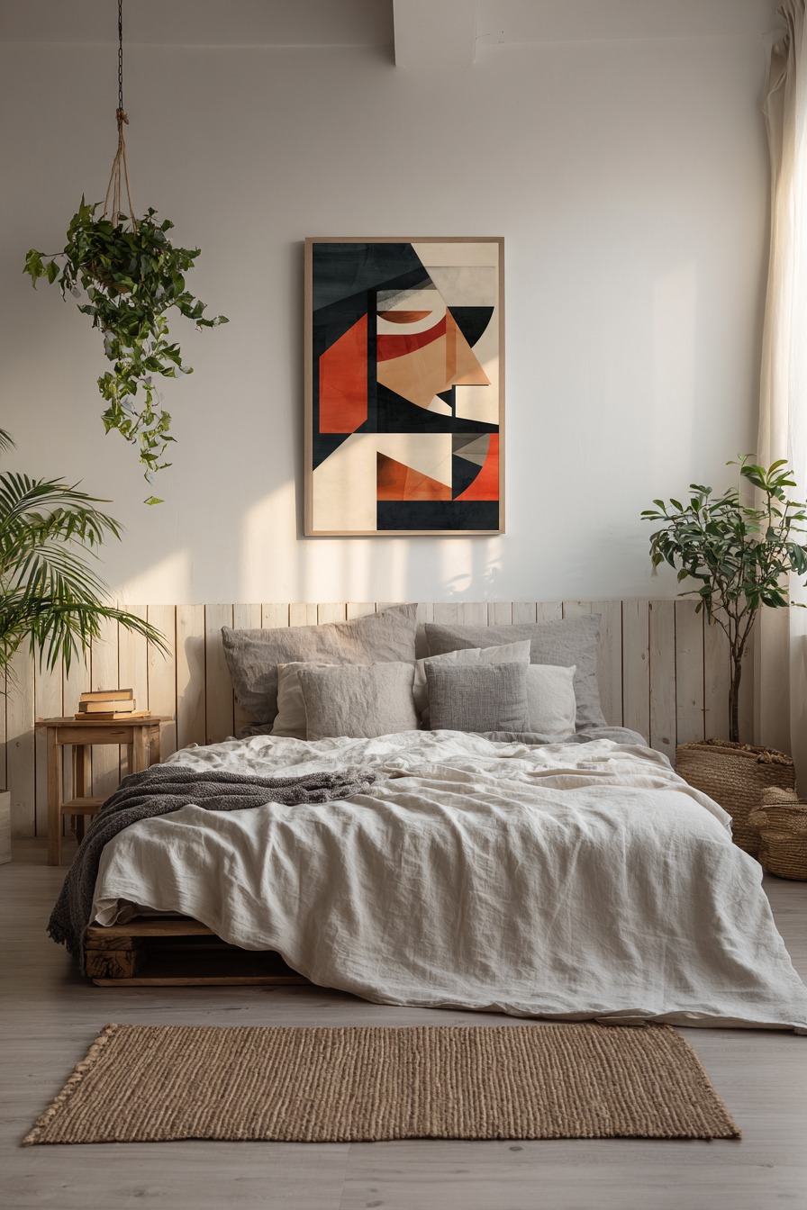 Geometrische Formen prägen ein stilisiertes Profil. Farbflächen in Orange und Schwarz. Klare kantige Strukturen.