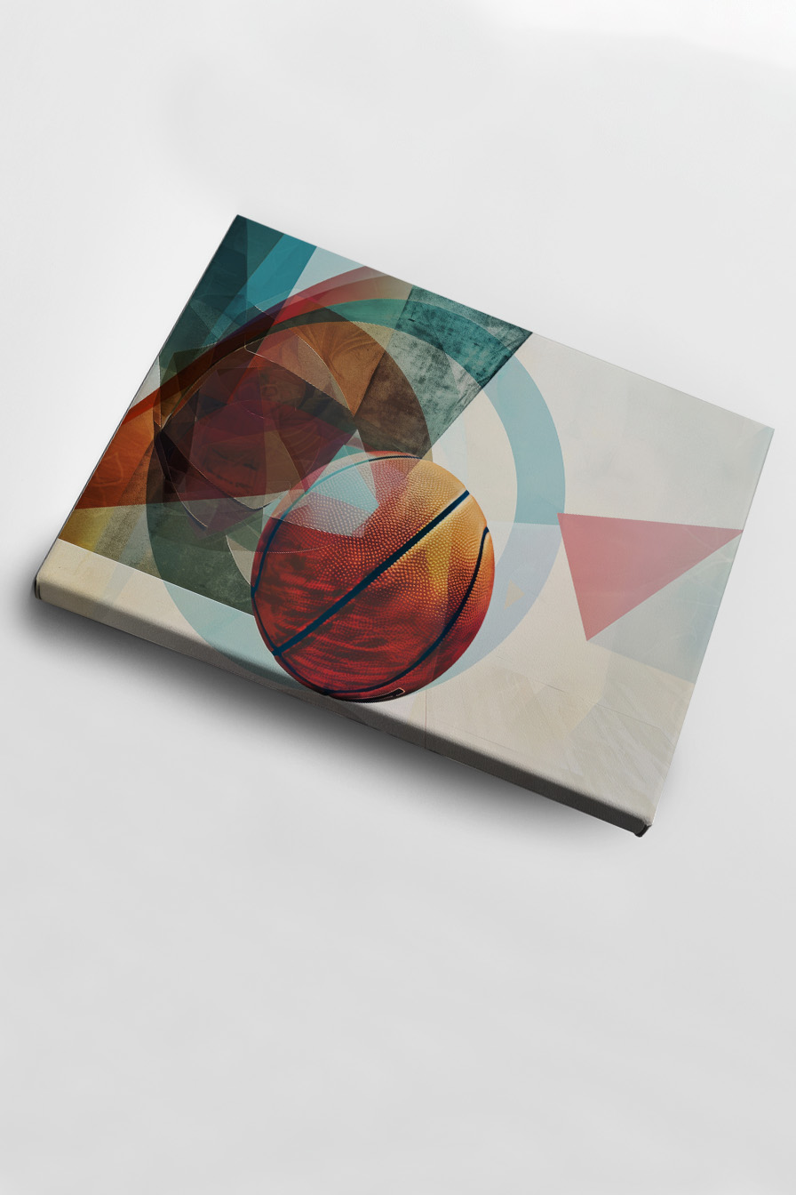 Die Kombination geometrischer Formen und der intensiven Farbenvielfalt erzeugt eine bewegte Dynamik. Der Basketball wirkt hier wie ein Objekt, das im Raum schwebt und Energie ausstrahlt.