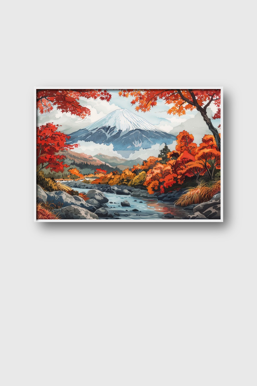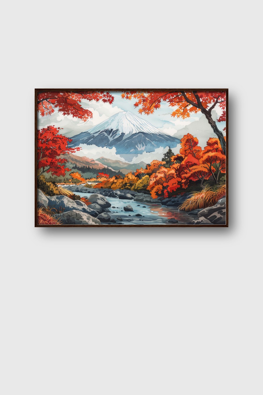 Der Berg mit roten Bäumen schafft eine ruhige und harmonische Wirkung im Raum.