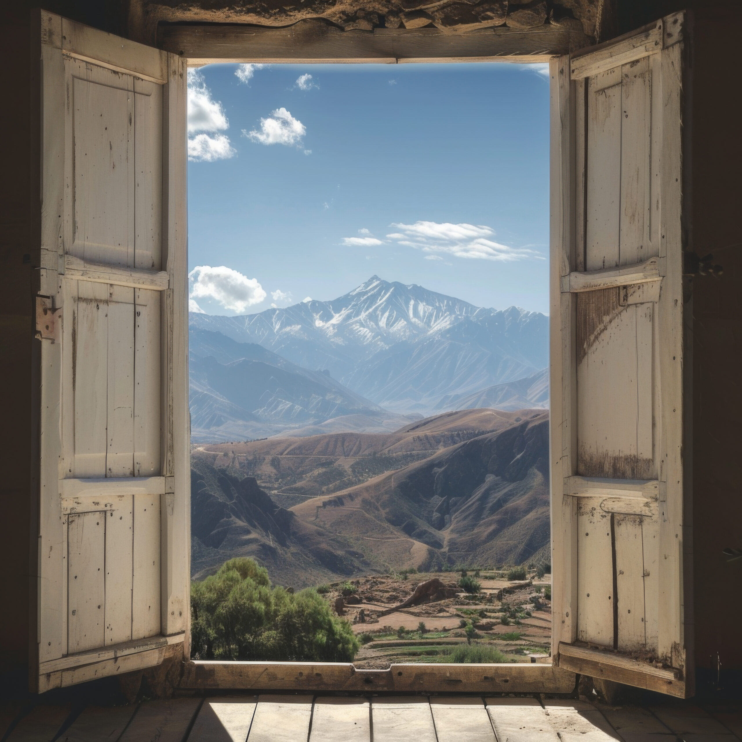 Die Landschaft entfaltet sich weit mit klaren Formen der Bergketten, deren Schatten die raue Textur der Hügel betonen, eingerahmt von den rustikalen Fensterläden.