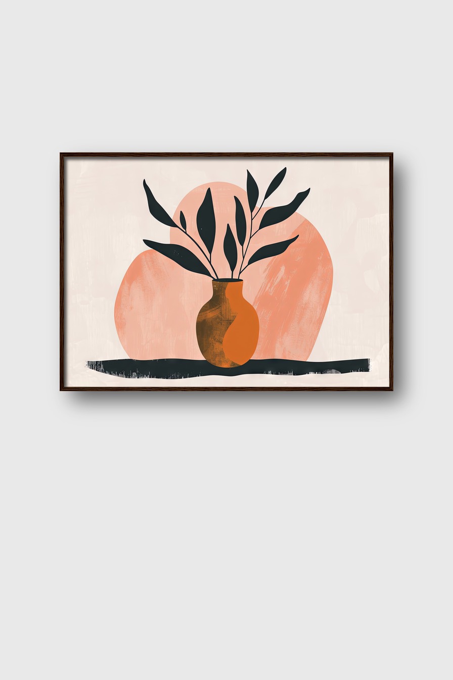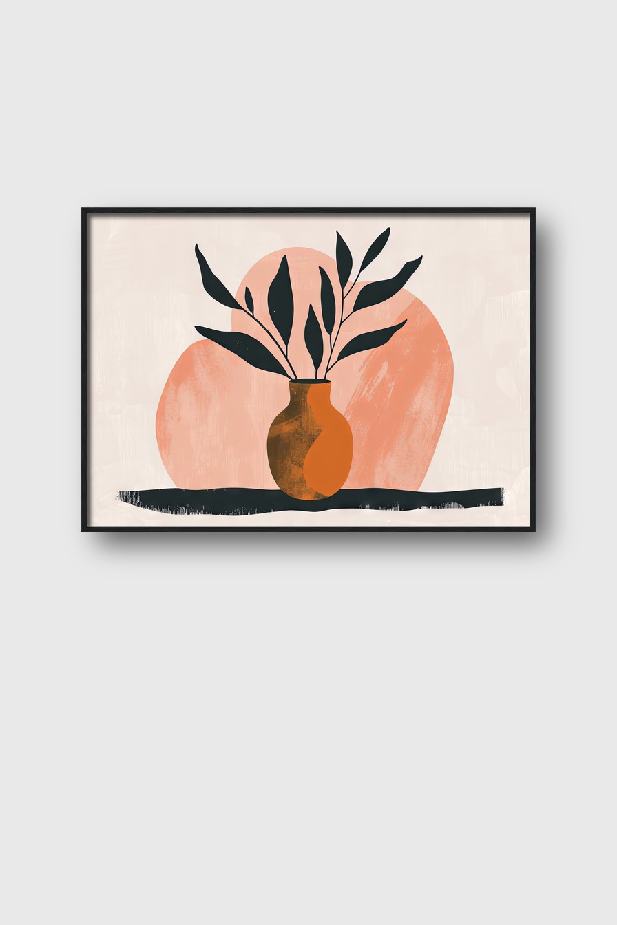 Das Motiv wirkt ruhig durch die klare Silhouette der Vase mit Blättern und die pastellfarbenen Flächen.