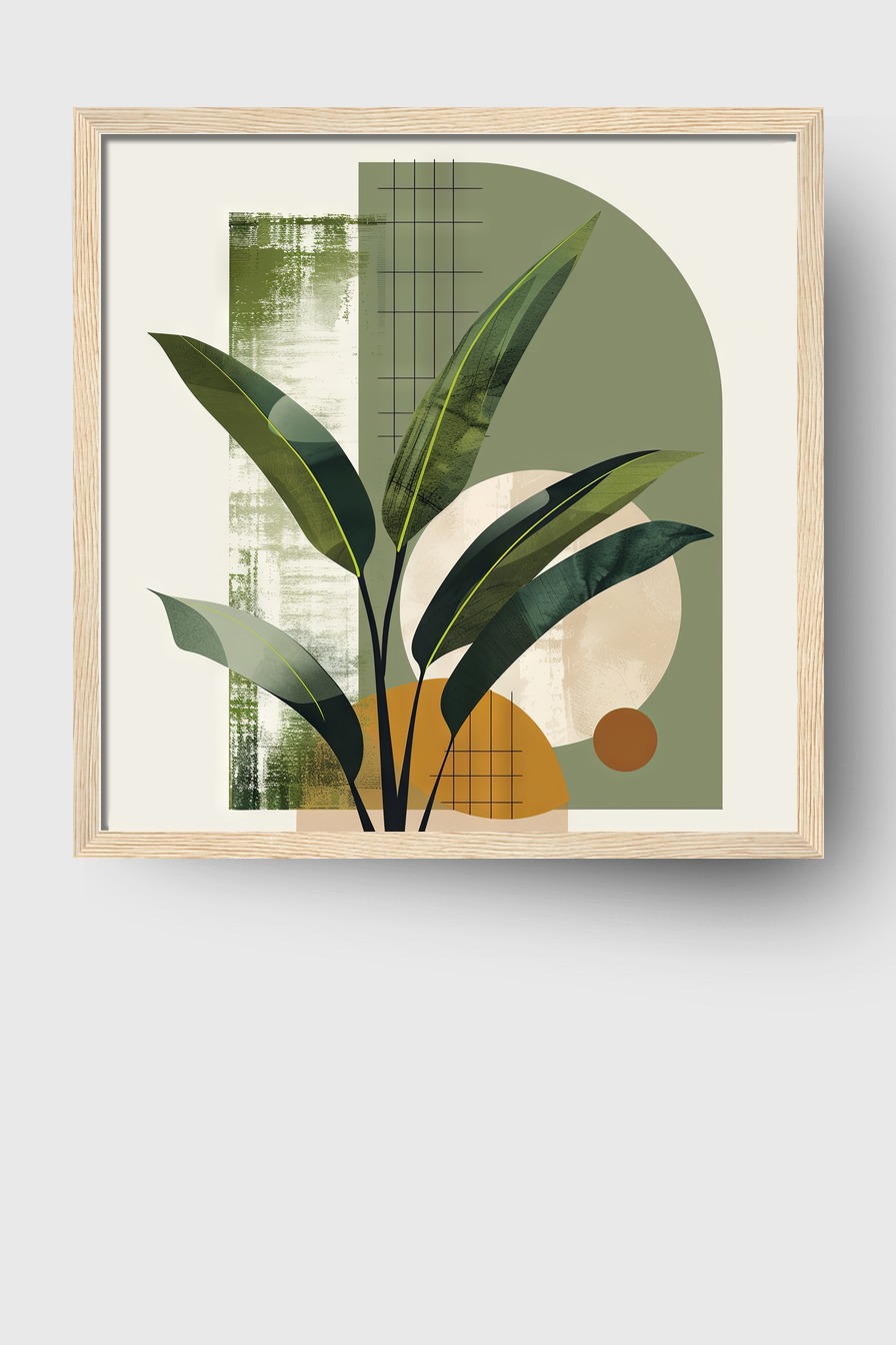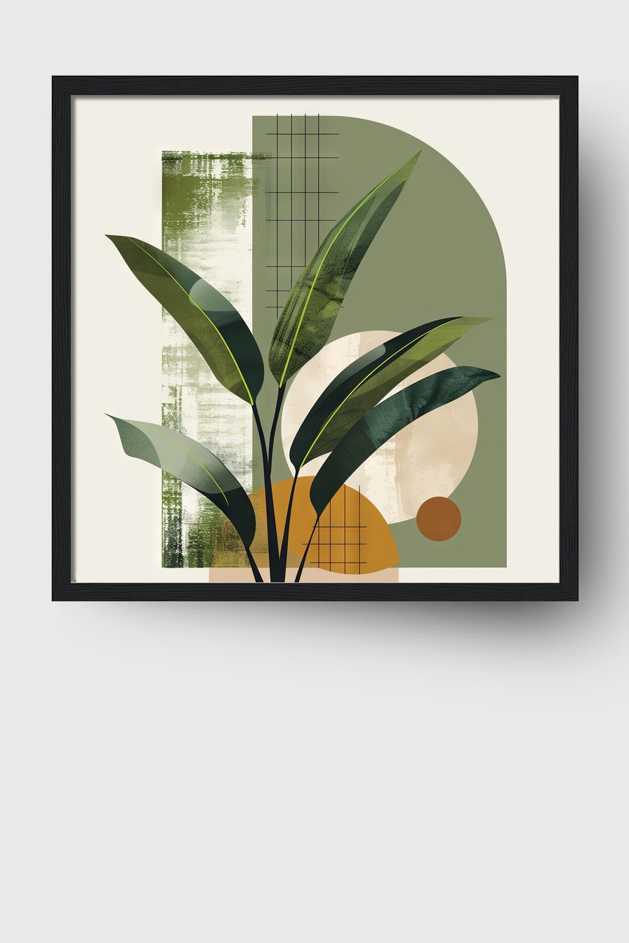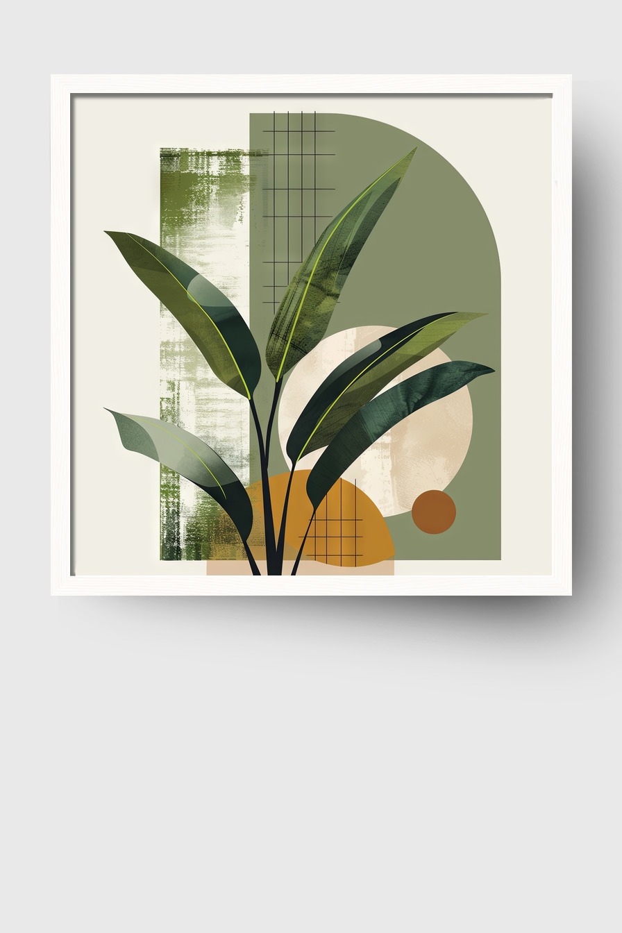 Dieses Arrangement aus Blattdetails und geometrischen Mustern schafft eine strukturierte, beruhigende Wirkung im Raum.