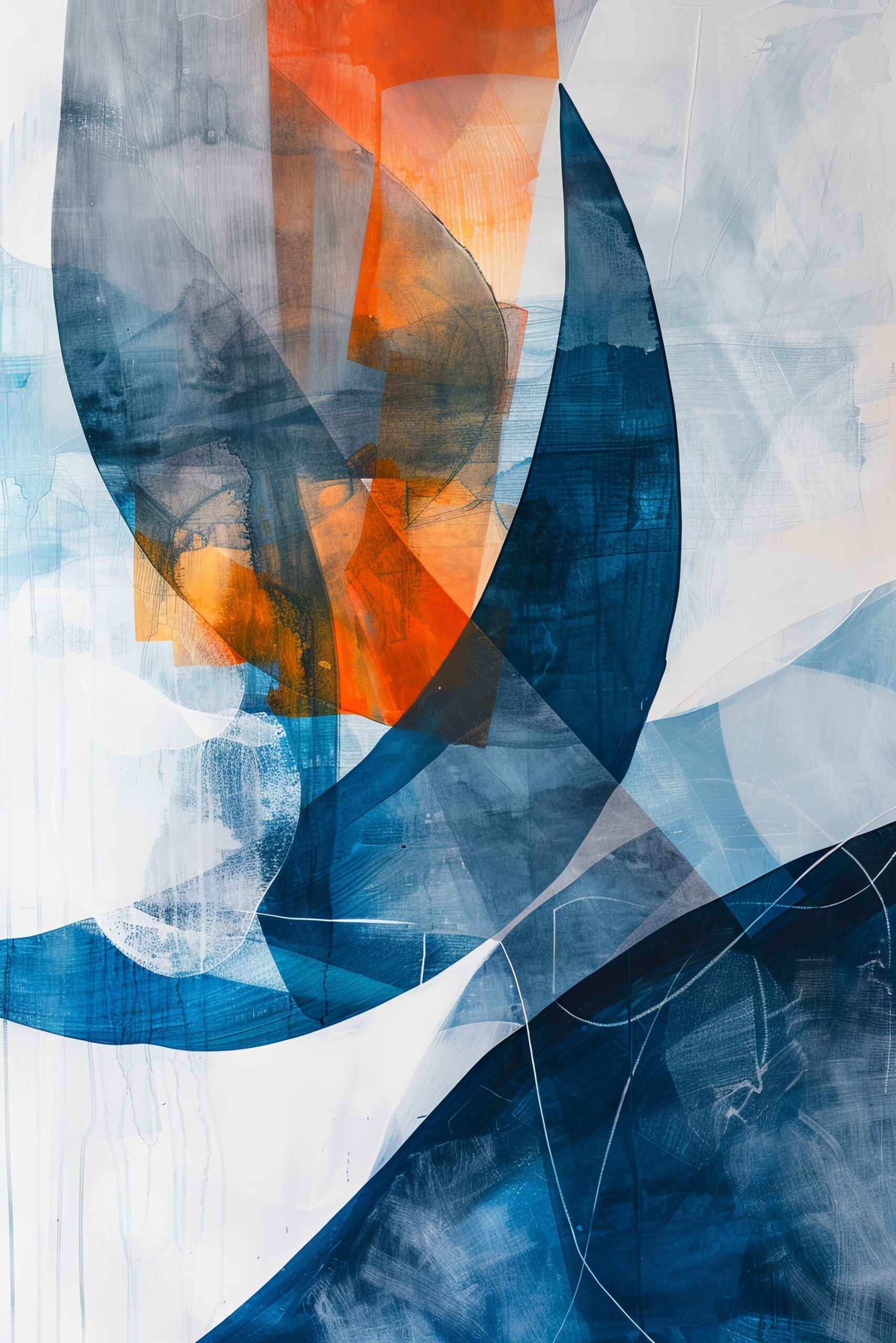 Feine, überlagernde Bögen in Blau- und Orangetönen bilden ein filigranes Netz aus Transparenzen und leichten Strukturen. Die Farbschichten spielen miteinander und erzeugen Tiefe trotz der abstrakten Formensprache.