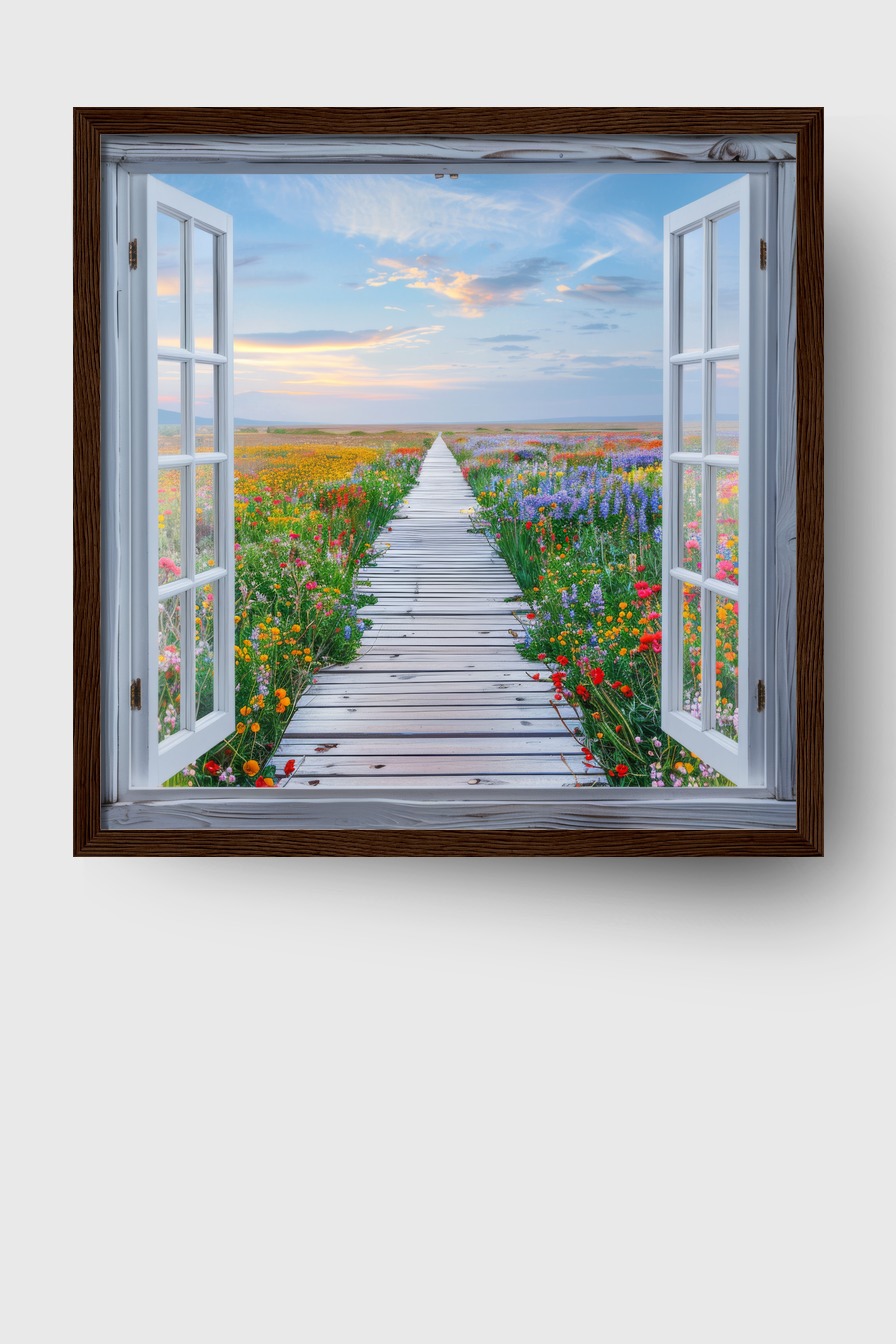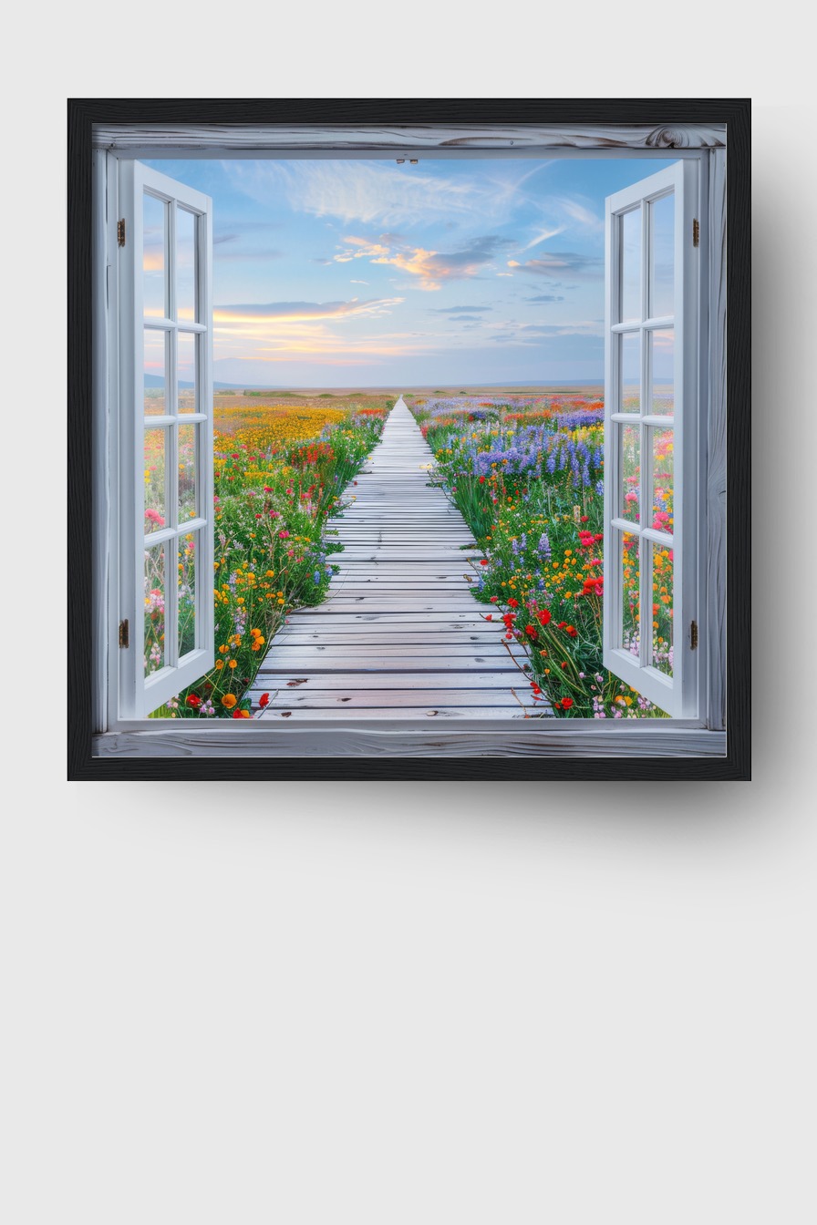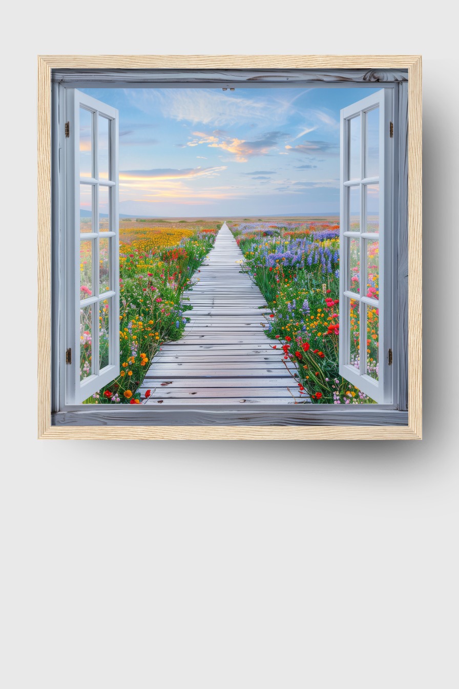 Der offene Fensterrahmen gibt dem Raum Tiefe und Weite, als ob man direkt hinaus in die bunte Blumenlandschaft schauen könnte. Die Farbspritzer der einzelnen Blüten bringen Lebendigkeit an die Wand und wirken als frischer Akzent in jedem Zimmer.