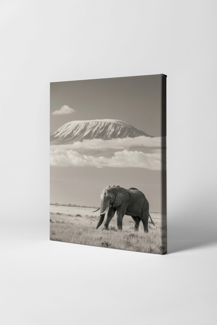 Ein imposanter Elefant dominiert die Szenerie, umgeben von weiter Grassteppe und einer eindrucksvollen Bergwand. Die Szenerie strahlt Ruhe und Erhabenheit aus und fängt den Geist der Wildnis ein.