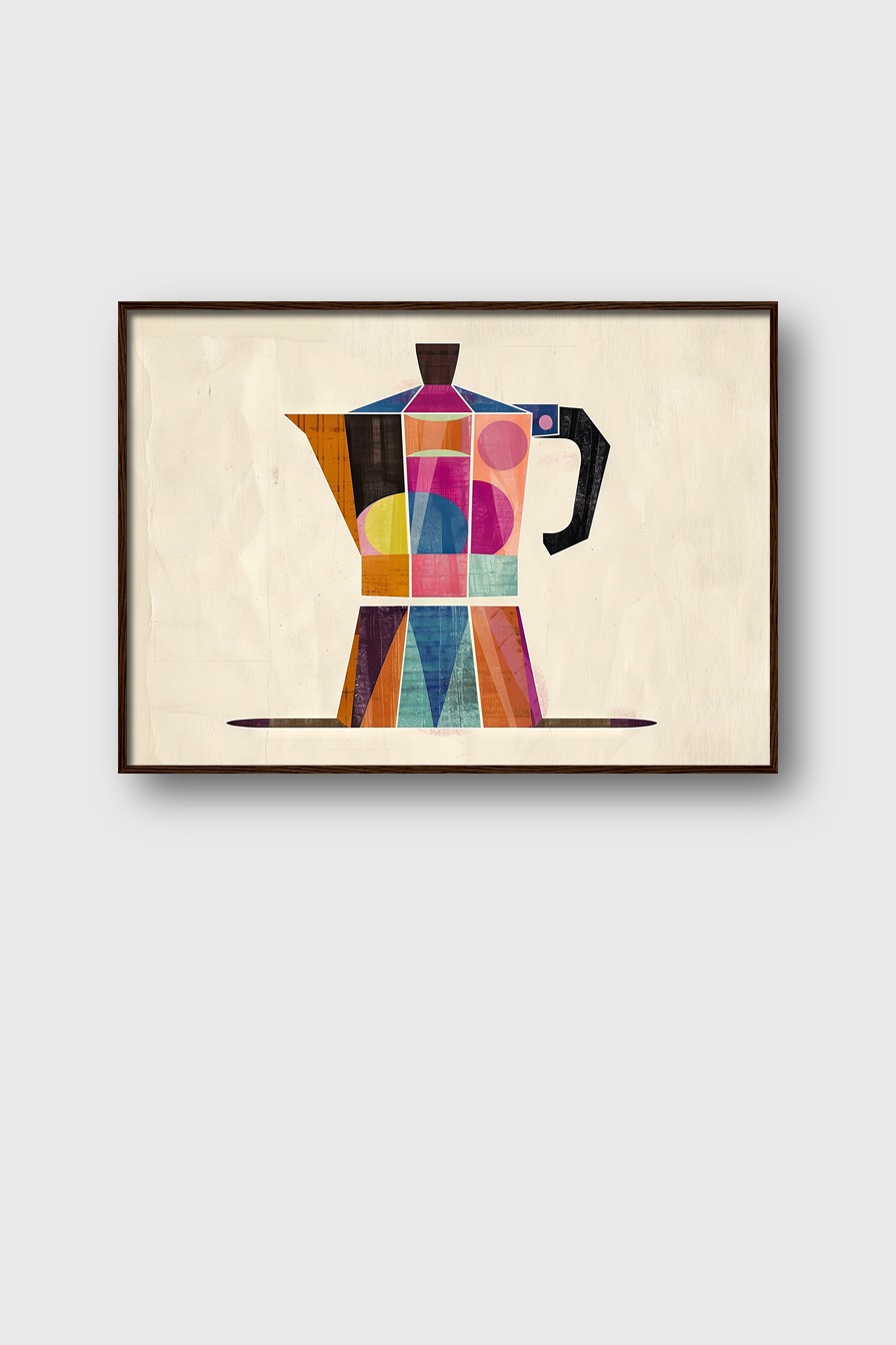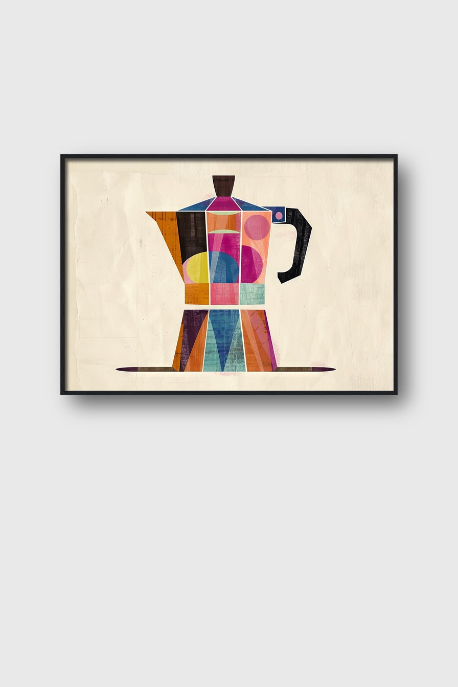 Eine bunte Espressokanne hebt sich durch klare geometrische Muster vom hellen Hintergrund ab. Setzt Farbe und Form im Raum.