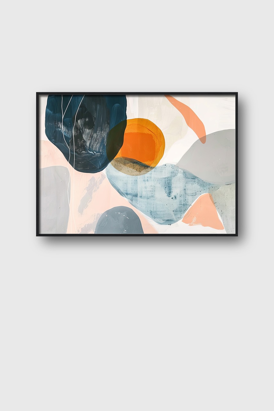 Im Raum entfaltet die Grafik eine moderne, elegante Atmosphäre. Der Kontrast von sanften Grau- und Beigetönen mit lebendigem Orange zieht Blicke an, während die abstrakten Formen Raum für eigene Interpretationen lassen. Ideal für ein Umfeld, das Ruhe mit einem Hauch Farbe verbinden möchte.