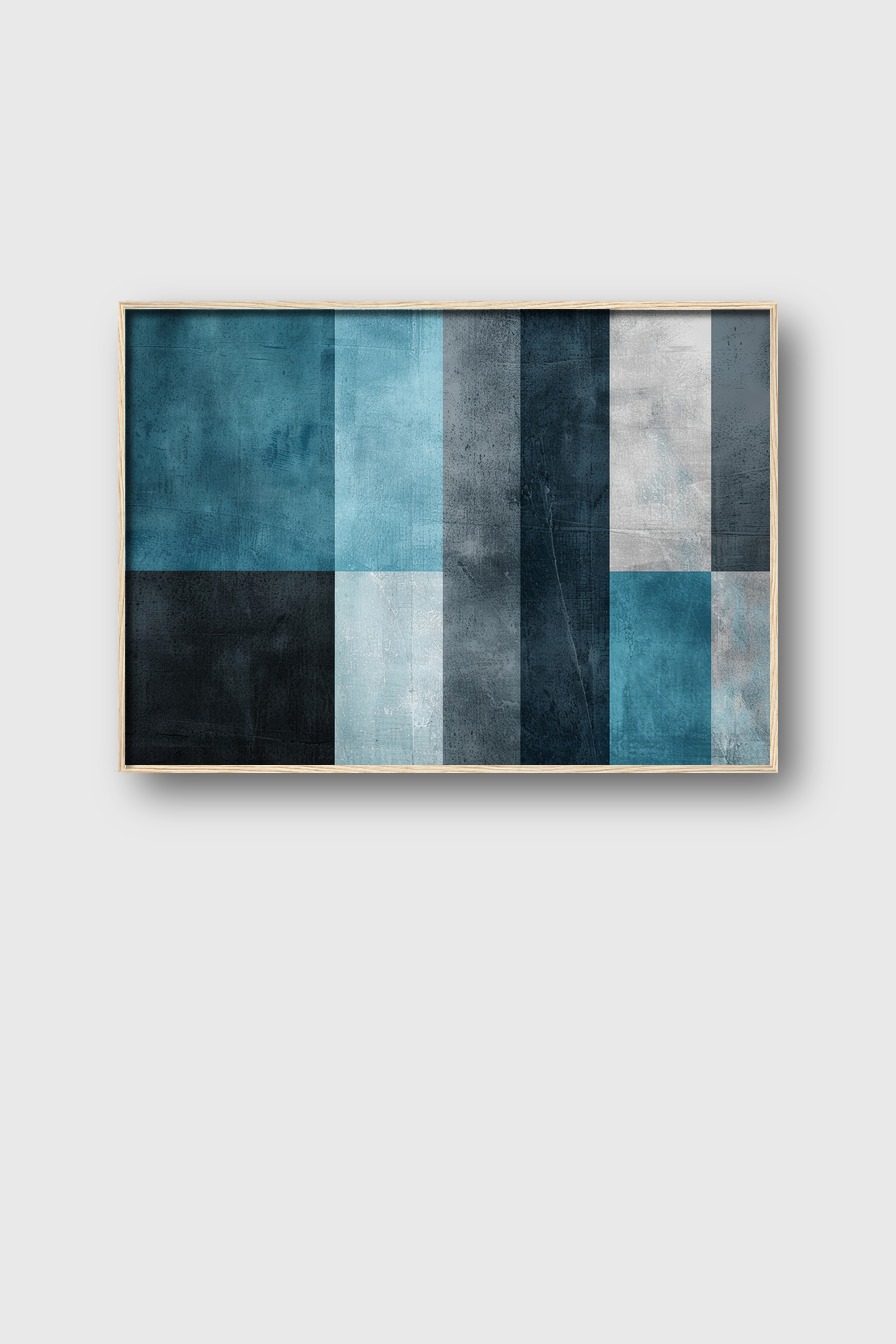 Räumliche Wirkung durch Textur und Farbwechsel. Linien erzeugen Rhythmus. Kühler Blauton dominiert den Raum.