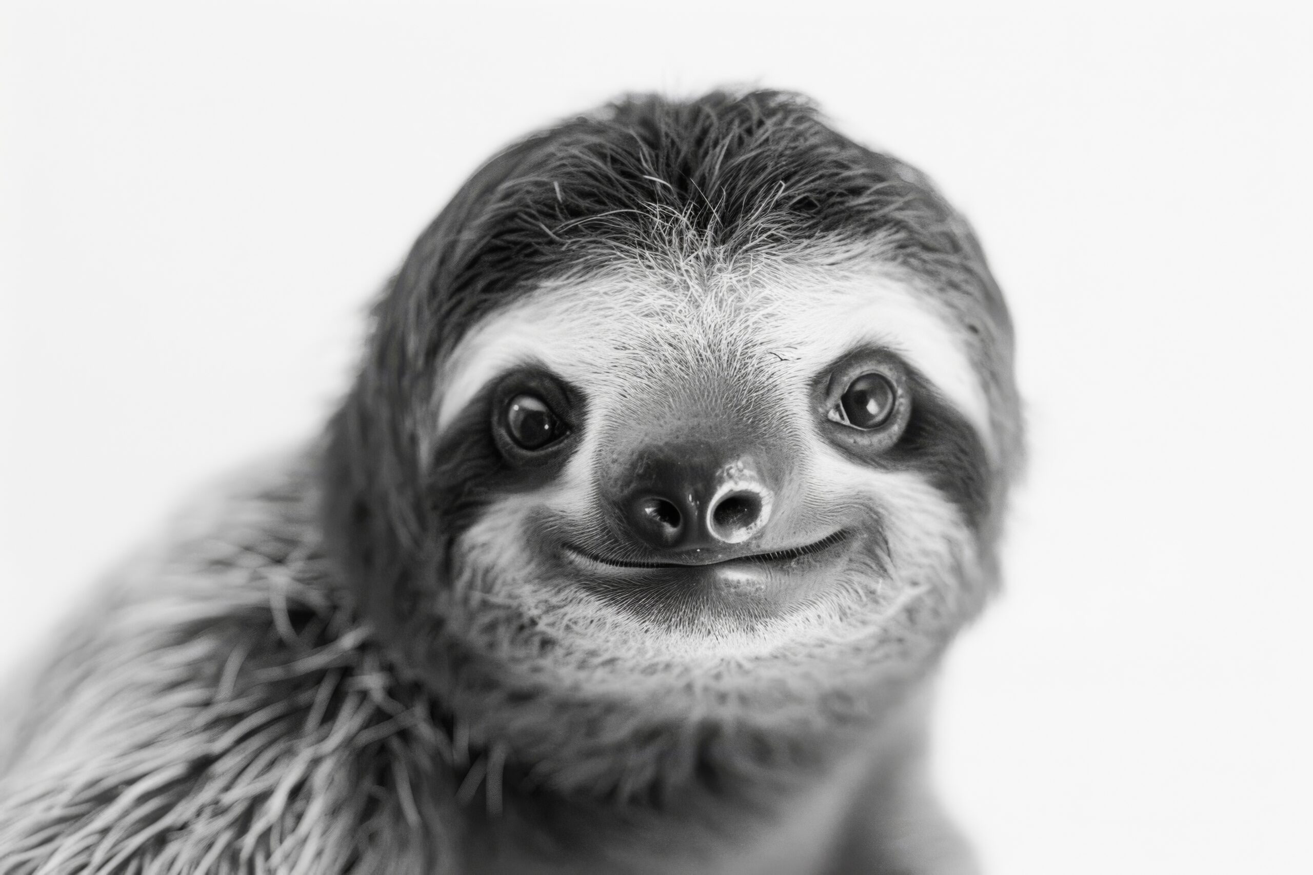 Langsames Tier, das gelassen lächelt, ruhige monochrome Töne ziehen den Blick auf die subtile Mimik und den markanten Nasenbereich.