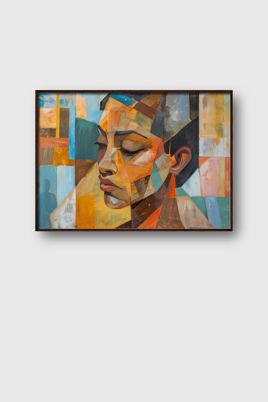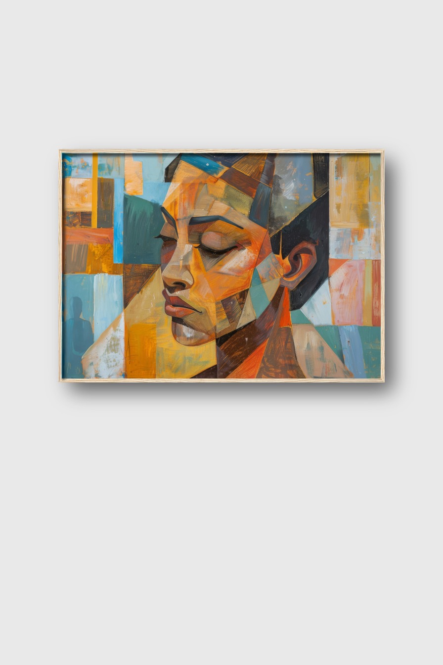An der Wand sorgt das abstrakte Frauenporträt für einen besonderen Blickfang. Die warmen Farben bringen Tiefe und Ruhe in den Raum, während die geometrischen Formen Struktur schaffen. Das Motiv fügt sich sowohl in moderne als auch klassische Wohnumgebungen ein und regt zum Verweilen und Nachdenken an.