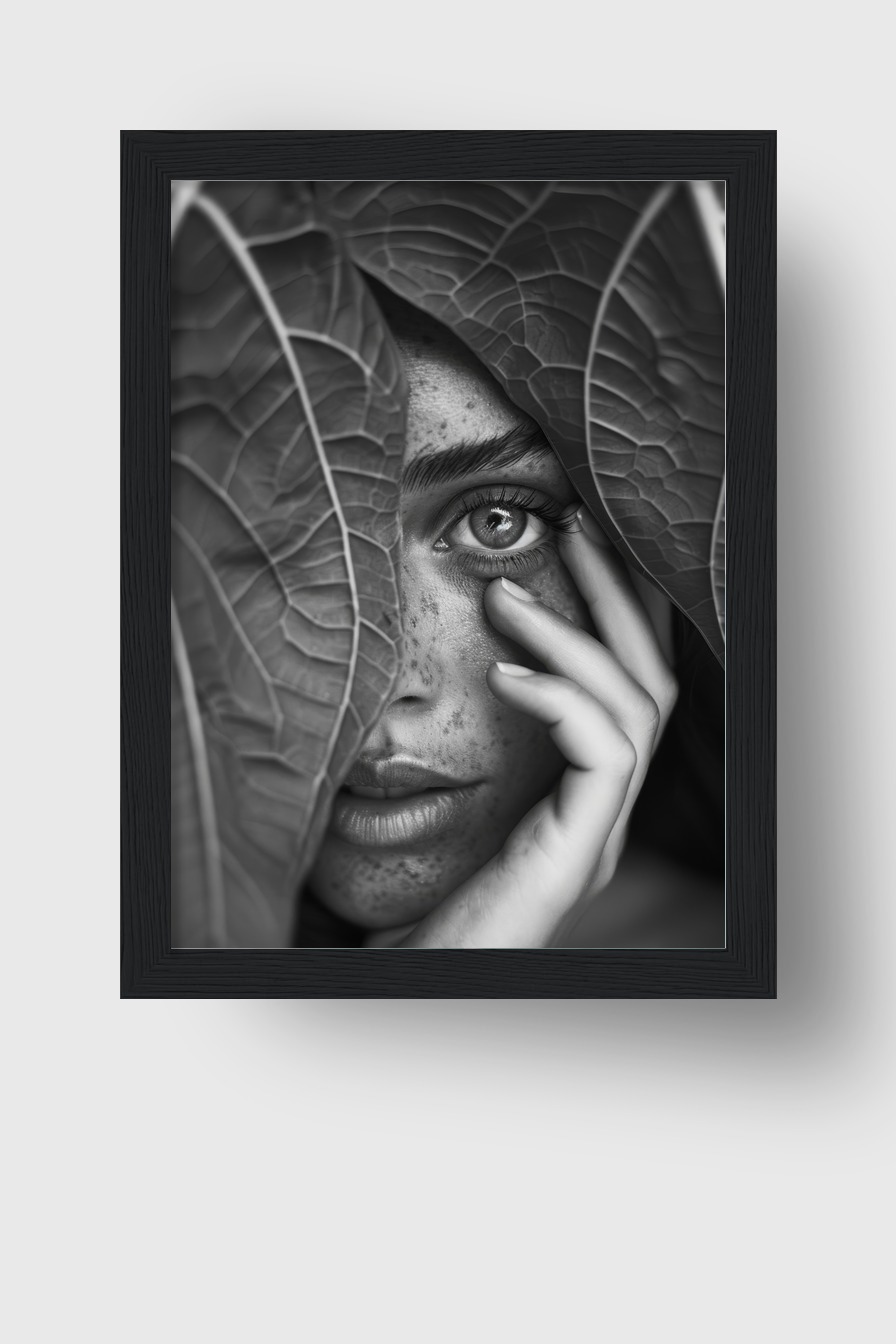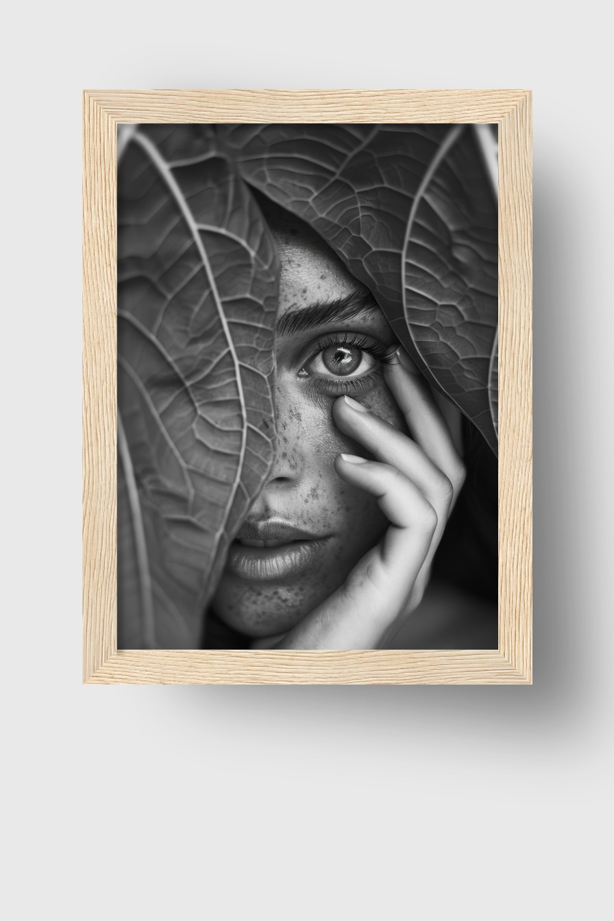 Im Raum zieht dieses Motiv die Blicke durch den starken Kontrast und die besondere Komposition an. Die Blätter eröffnen einen Rahmen, der das Gesicht wie einen geheimen Blickfang wirken lässt.