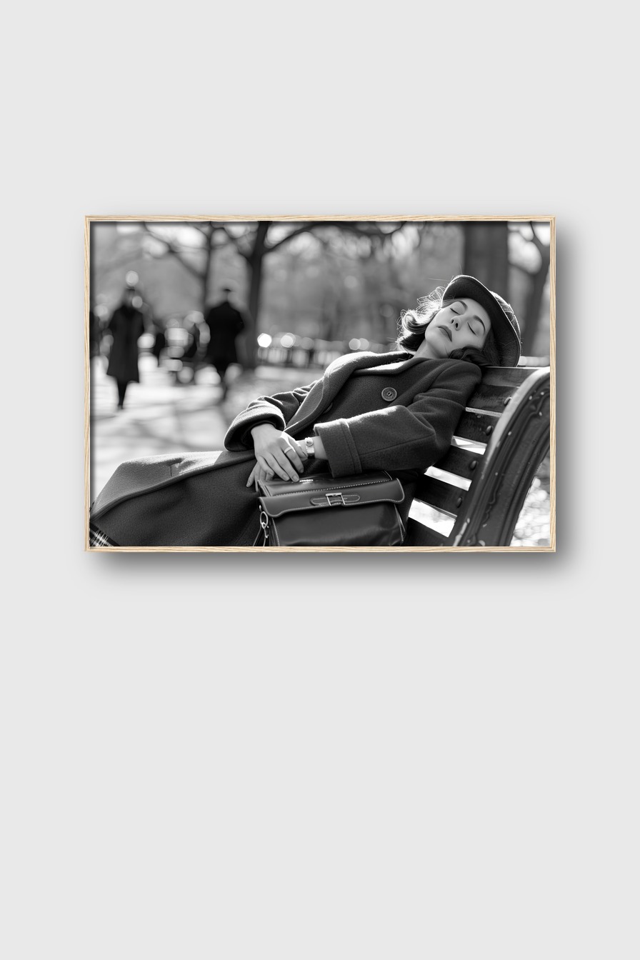 Im Raum erzeugt das Bild eine meditative Stimmung, die zum Verweilen einlädt. Die klare Schwarz-Weiß-Darstellung hebt die Formen und das menschliche Detail hervor, ohne von der Ruhe der Pose abzulenken.