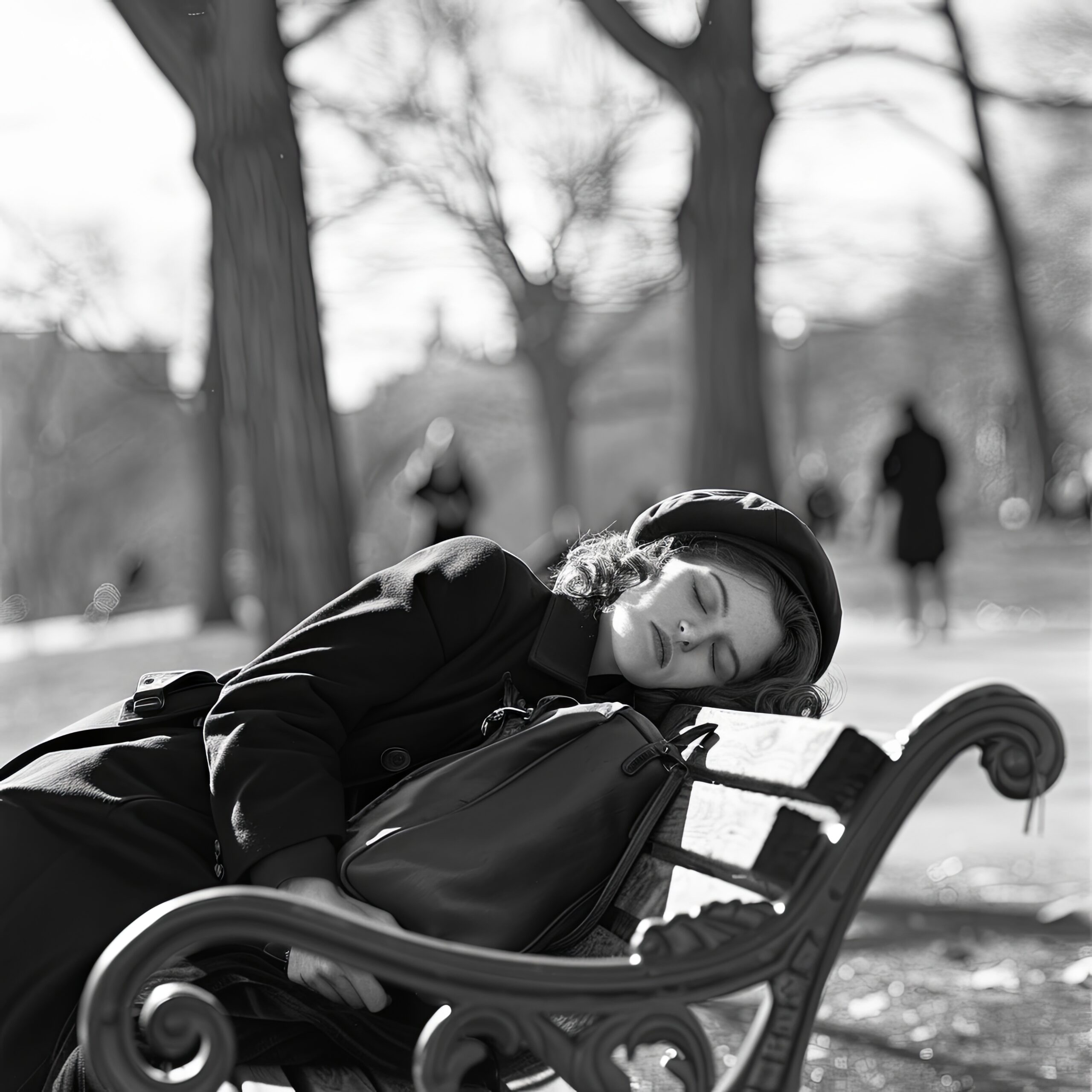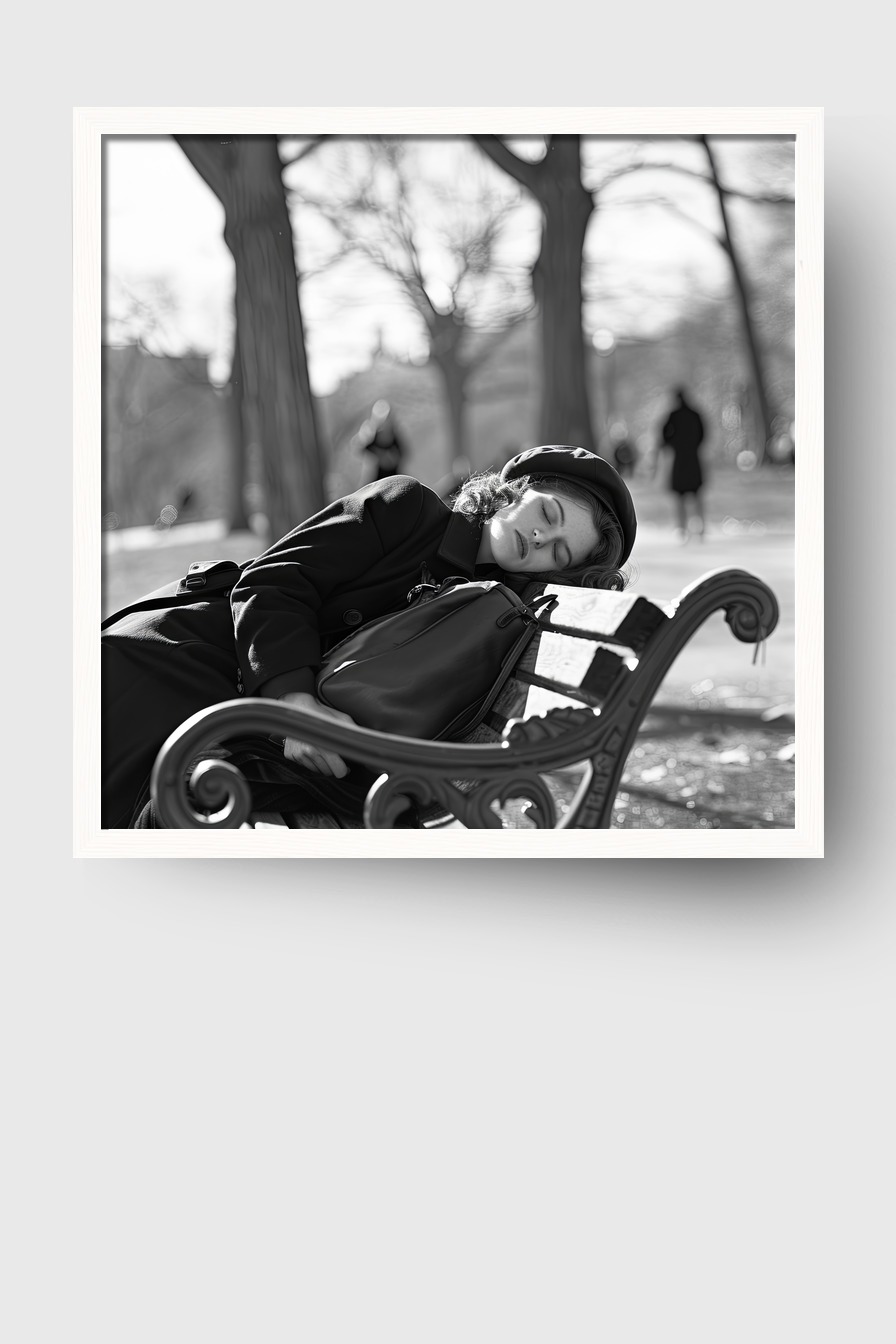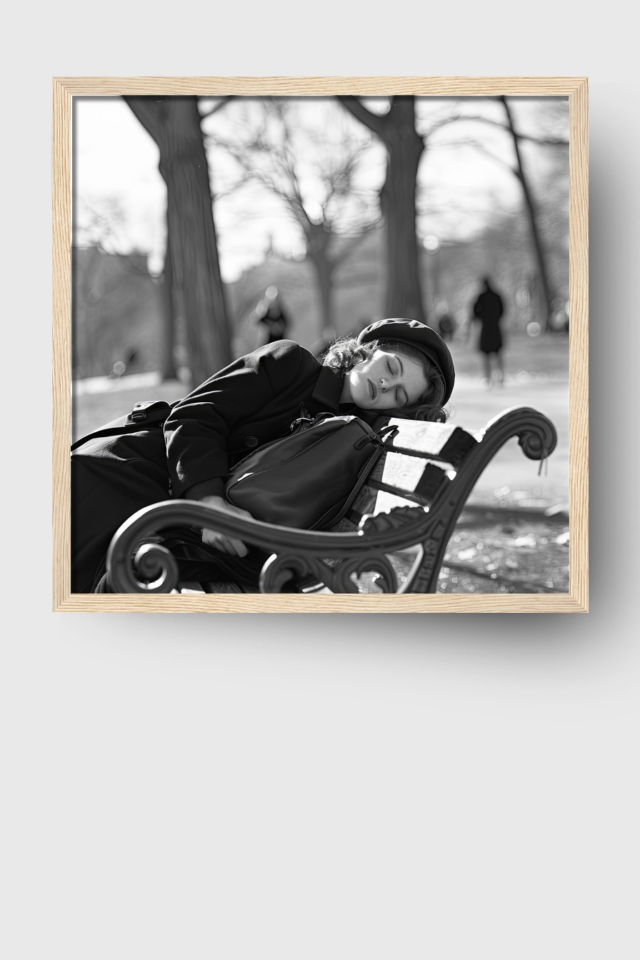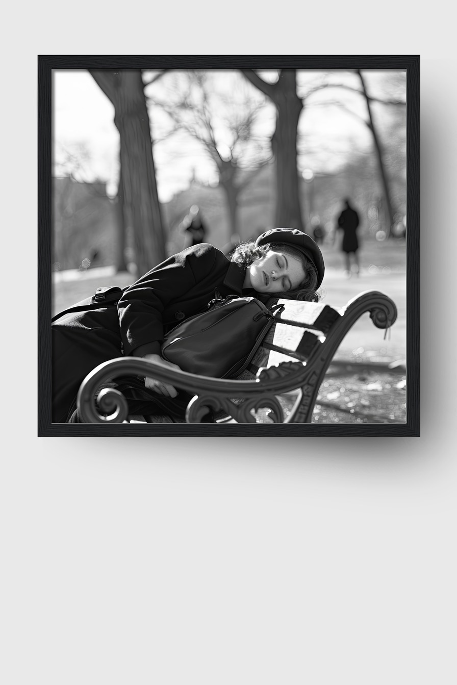 Die Darstellung einer Frau, die friedlich auf einer Bank ruht, bringt eine ruhige Präsenz in den Raum. Der unscharfe Hintergrund gibt Tiefe, während das klare Gesicht zum Verweilen einlädt. Ein ruhiger Blickfang, der Stille und Gelassenheit ausstrahlt.