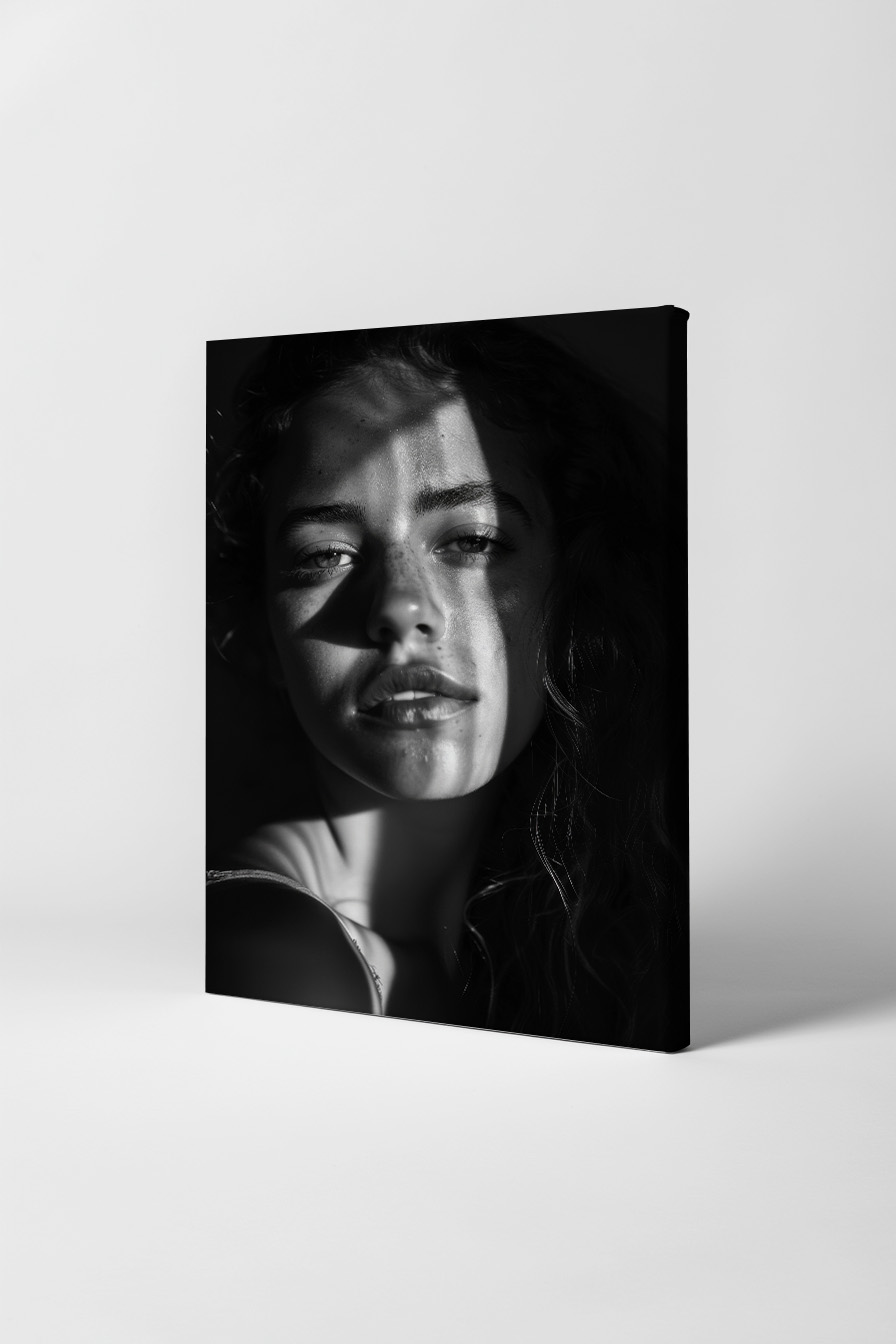 Die kontrastreiche Lichtführung hebt den sanften Ausdruck hervor, während die Schatten halbseitig das Gesicht formen und Spannung erzeugen.