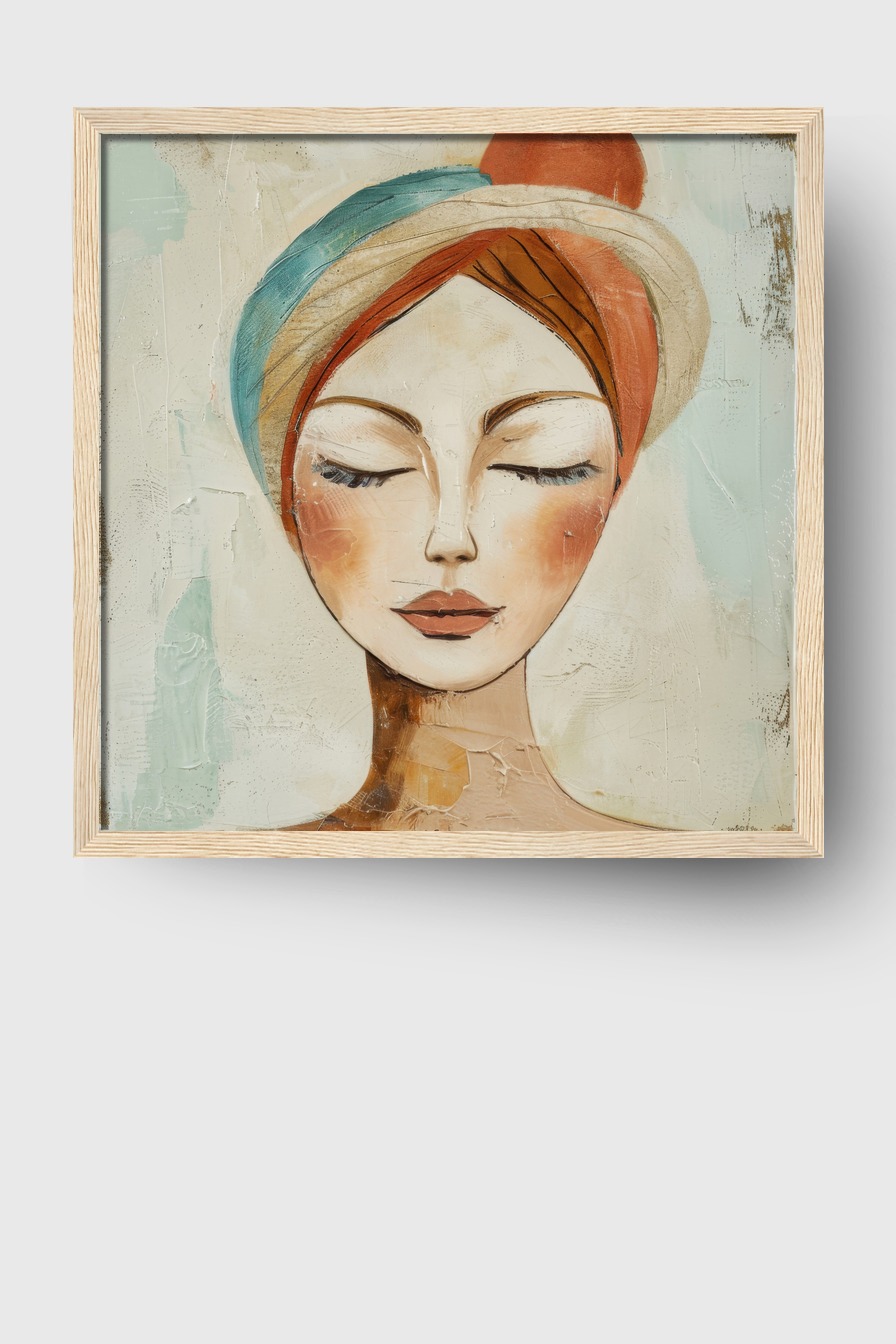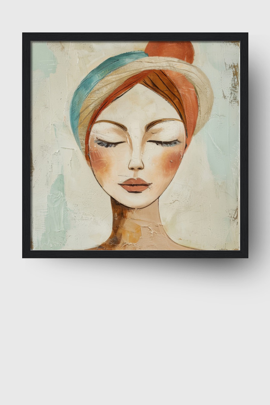 Der gerahmte Blick auf das Gesicht mit dem auffälligen Turban schafft einen Fokuspunkt, der Räume mit zurückhaltender Intensität füllt. Es ist eine Präsenz, die nicht laut wird, aber eine kantige Ausstrahlung hinterlässt. Ideal für Räume mit klaren Linien und zurückhaltender Einrichtung.