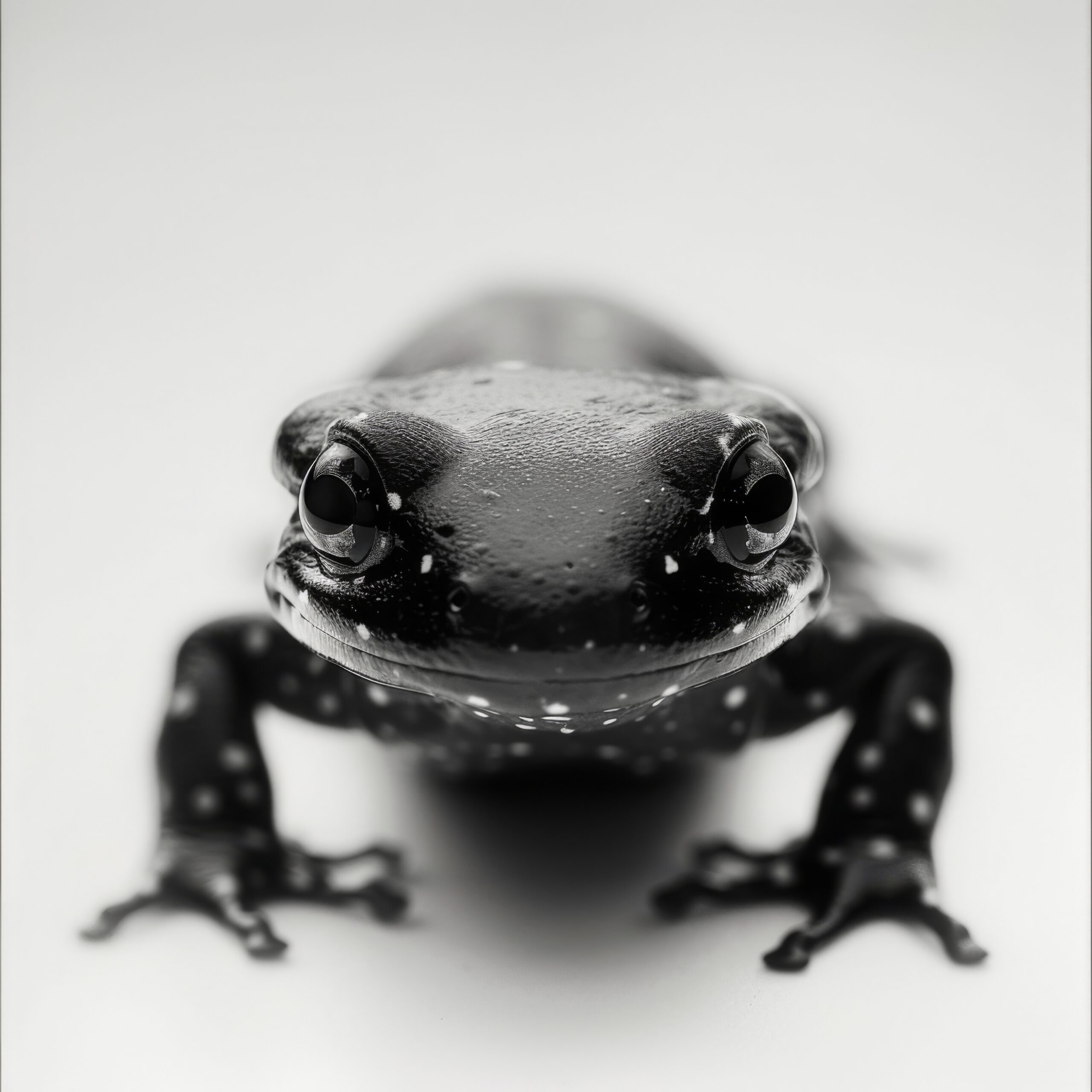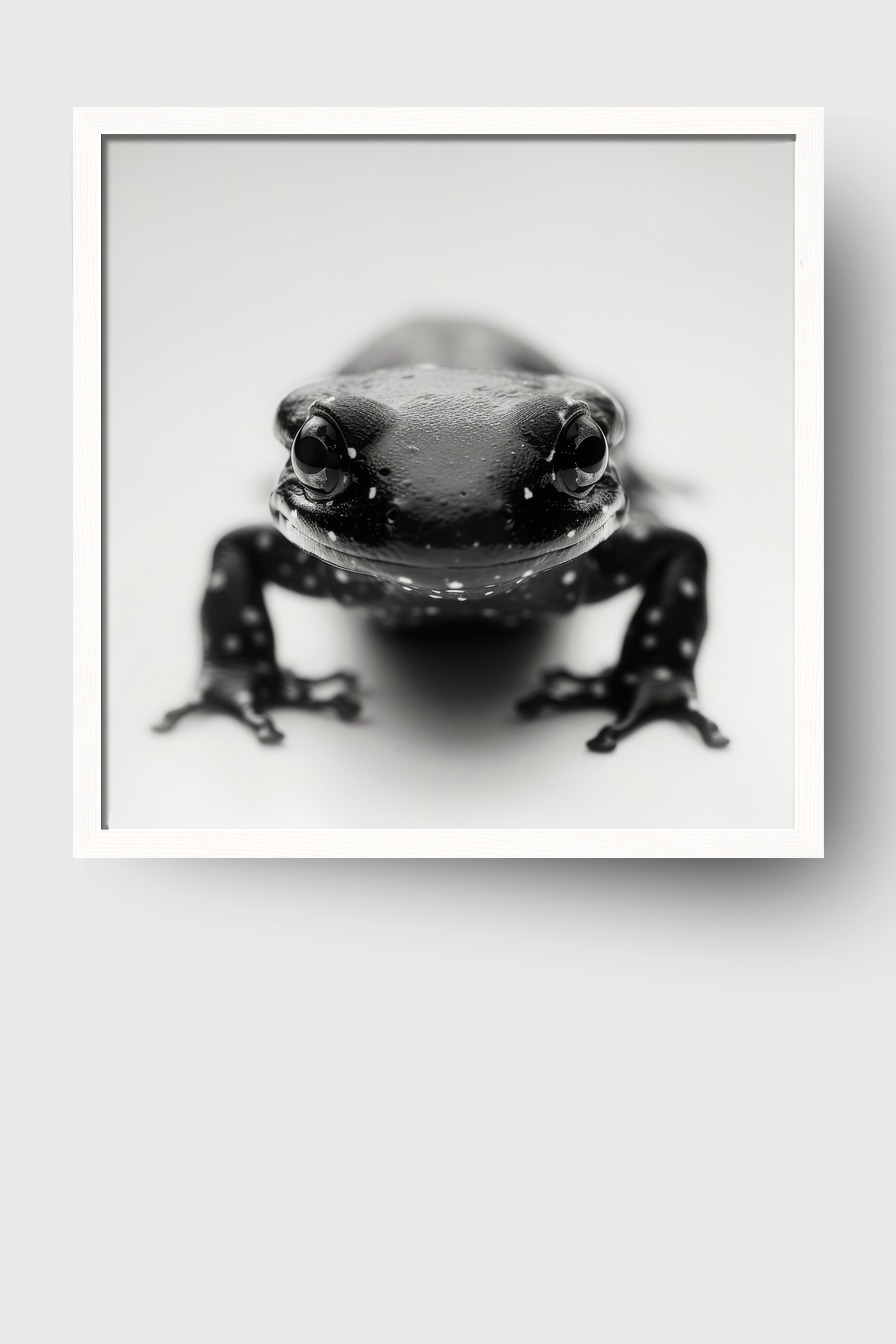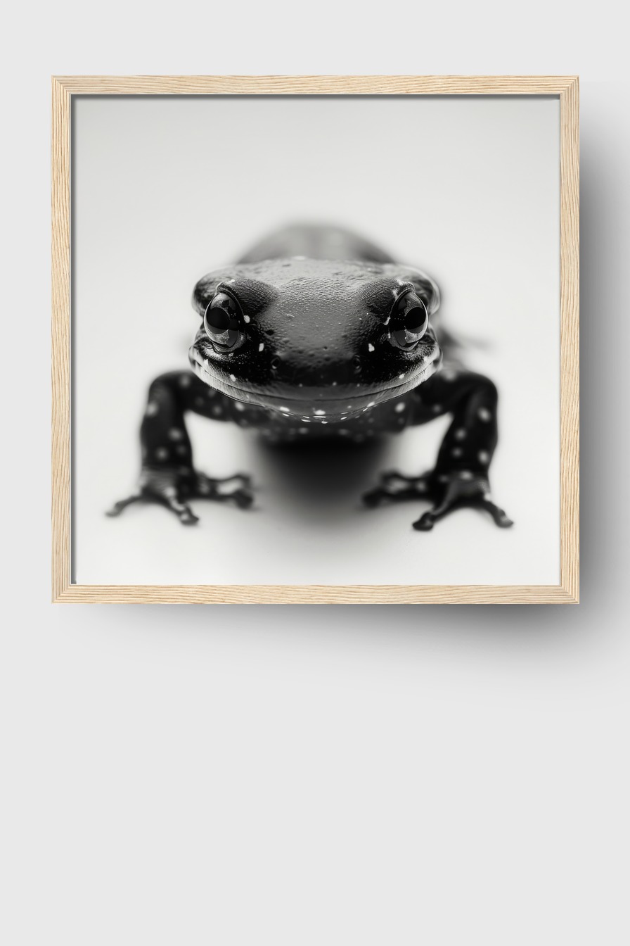 Im Raum wirkt der Frosch durch seine markanten Kontraste lebendig und fokussiert. Die Details der Hauttextur ziehen den Blick auf sich und setzen ein ausdrucksstarkes Naturmotiv in Szene.