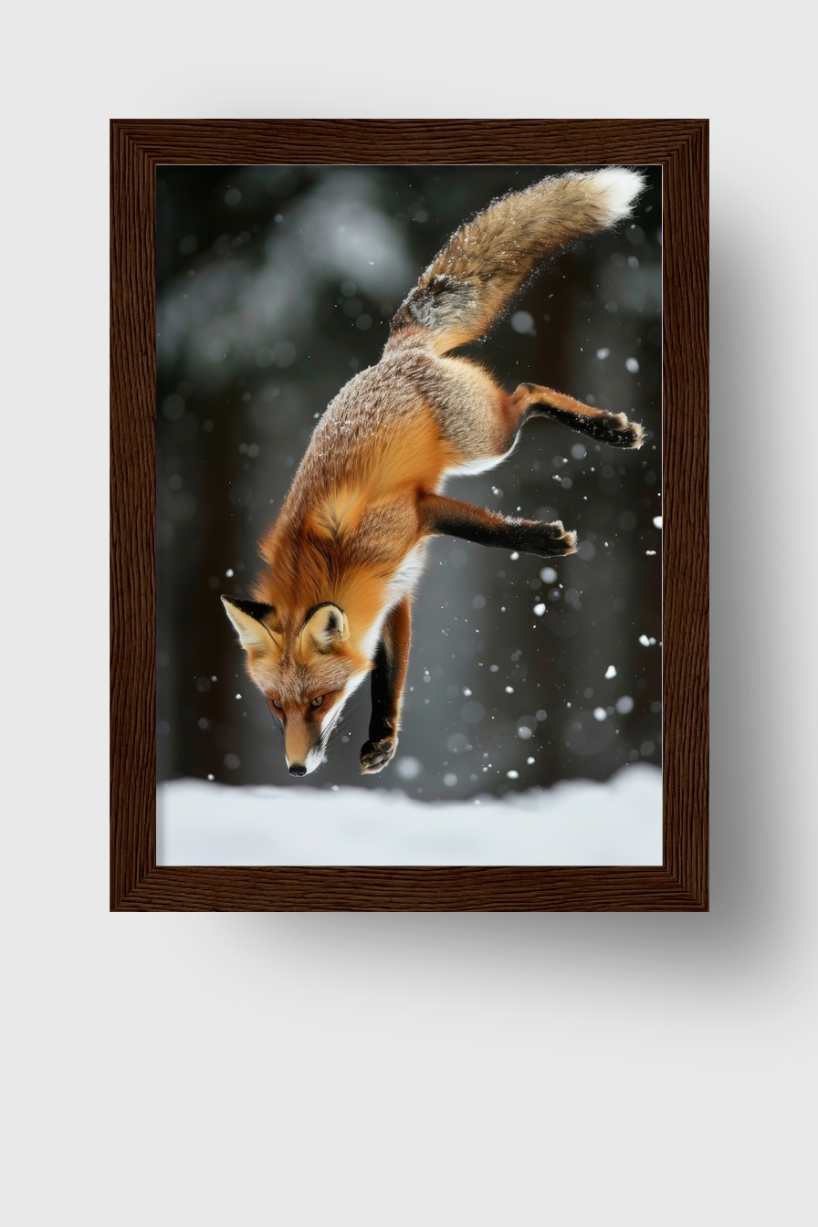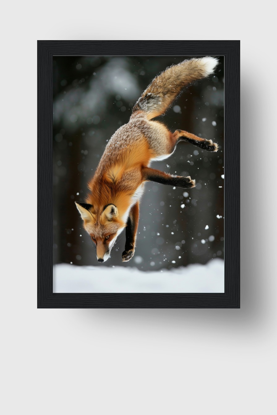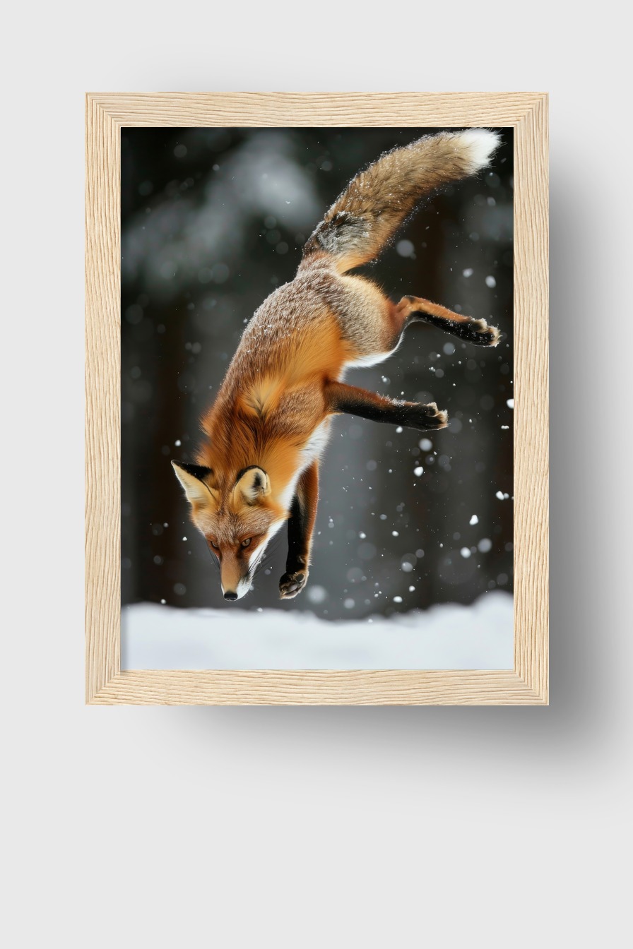Das Bild bringt Energie und Lebendigkeit in den Raum, die geschwungene Haltung des Fuchses lockert jede Wand auf, die fallenden Schneeflocken-wecken Aufmerksamkeit und erzeugen Tiefe