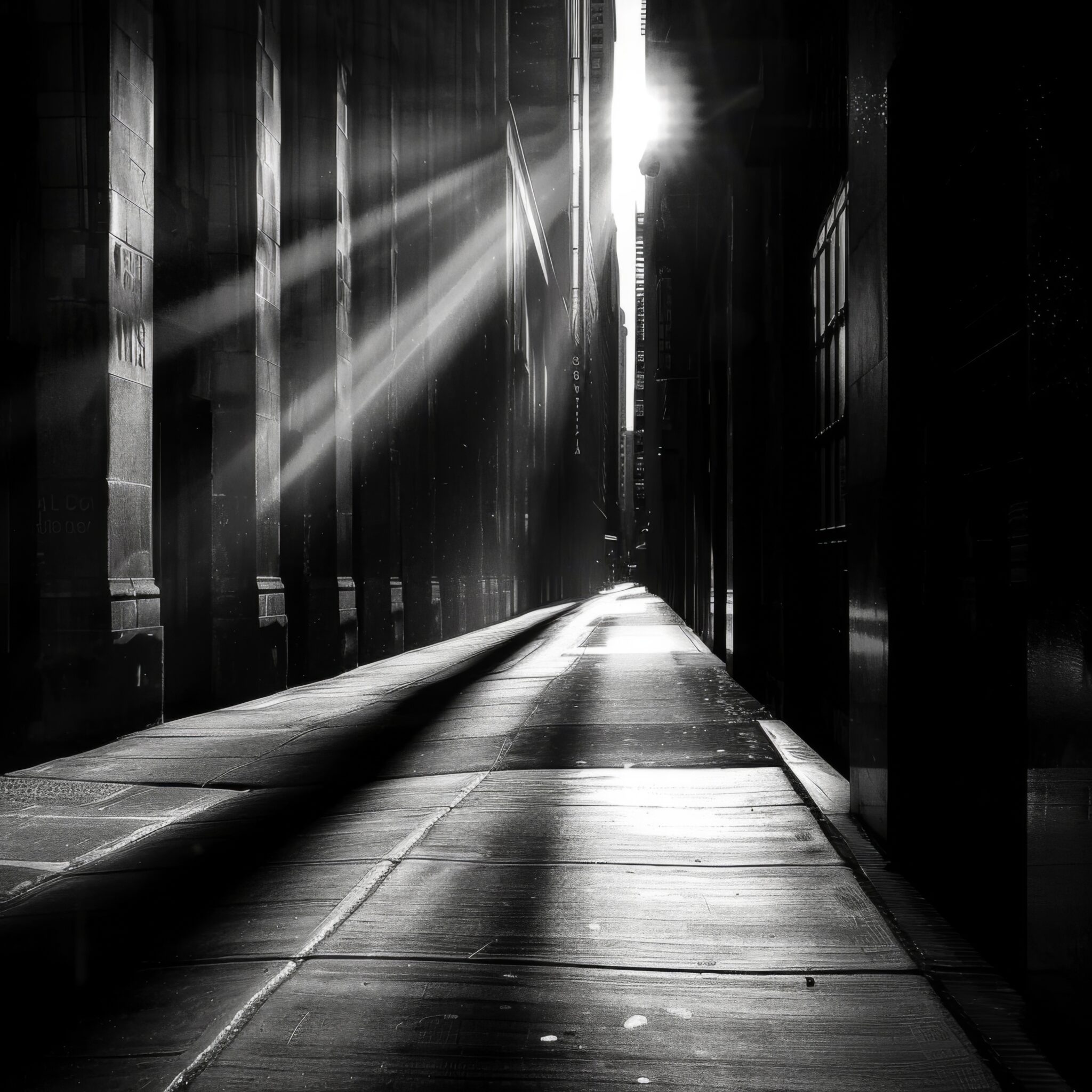 Licht fällt durch eine schmale Gasse. Betonboden und Hauswände zeigen lange Schatten.