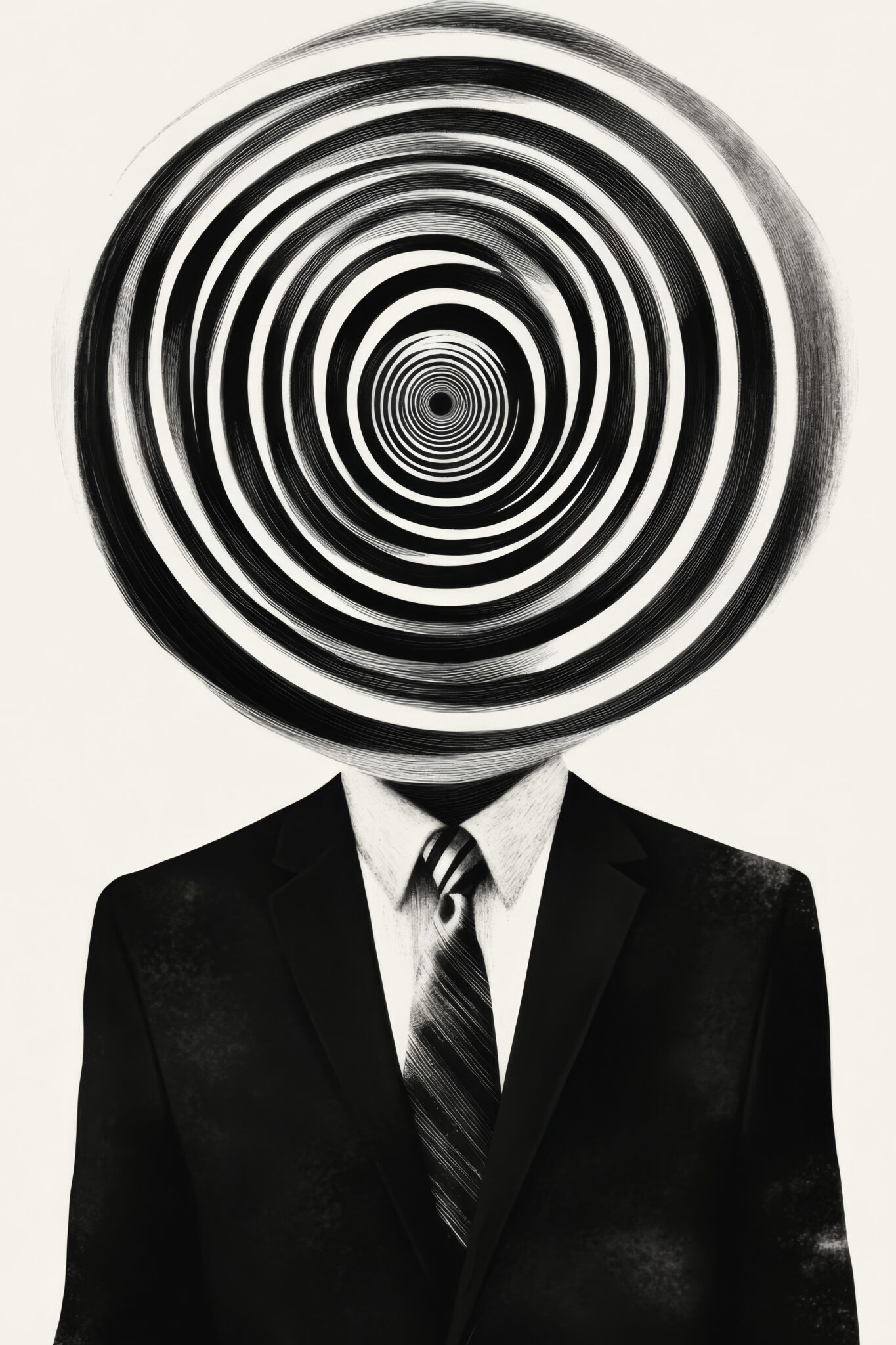 Im Raum zieht die große Spirale jeden Blick an und setzt einen kraftvollen Kontrast zum klassischen Anzug, der gleichzeitig Ordnung und Chaos vereint.