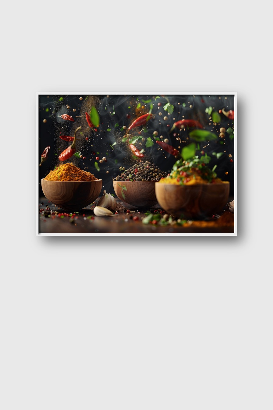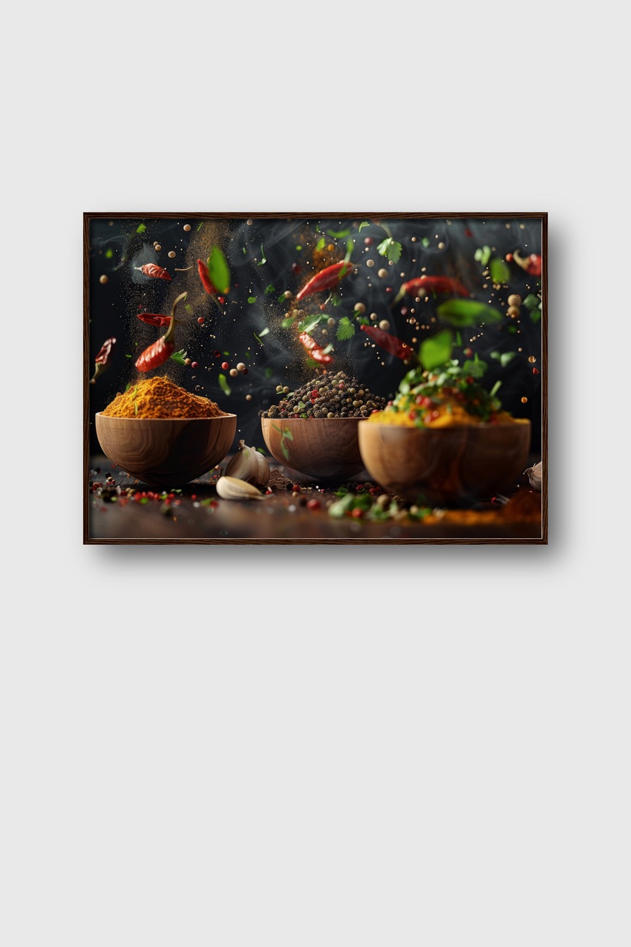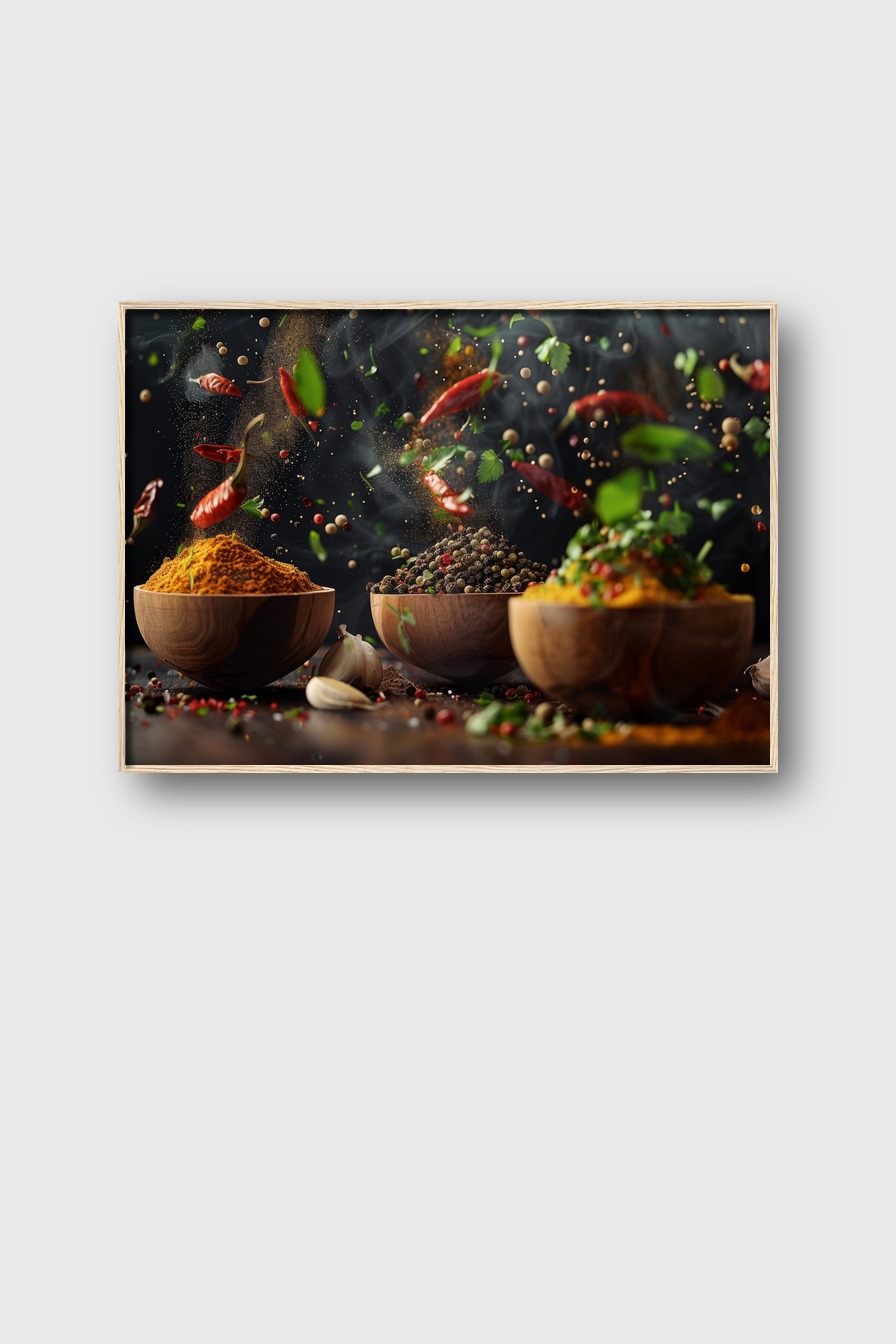 Die fliegenden Gewürze setzen einen akzentuierten Impuls im Raum. Die Dynamik und Farbtupfer machen das Bild zum Hingucker in Küche oder Esszimmer.