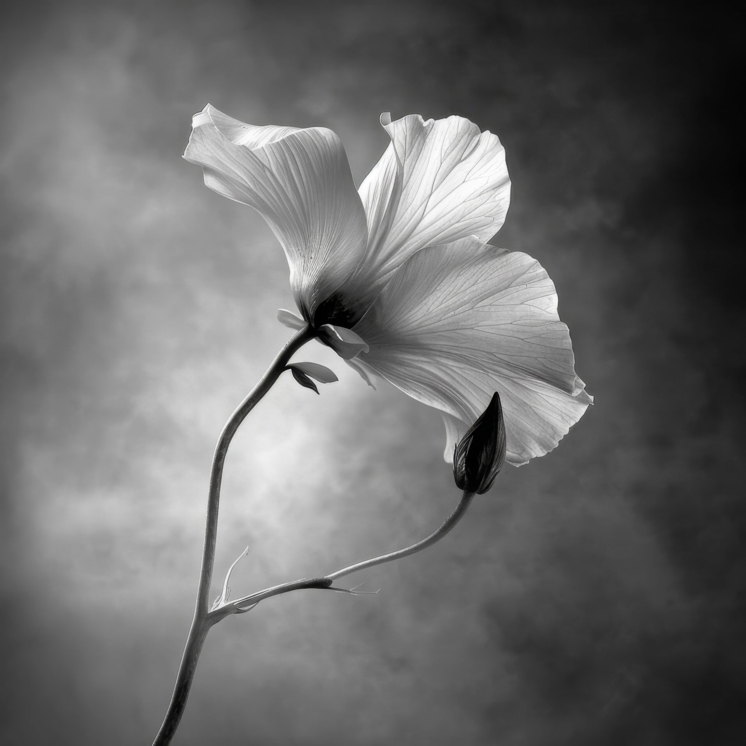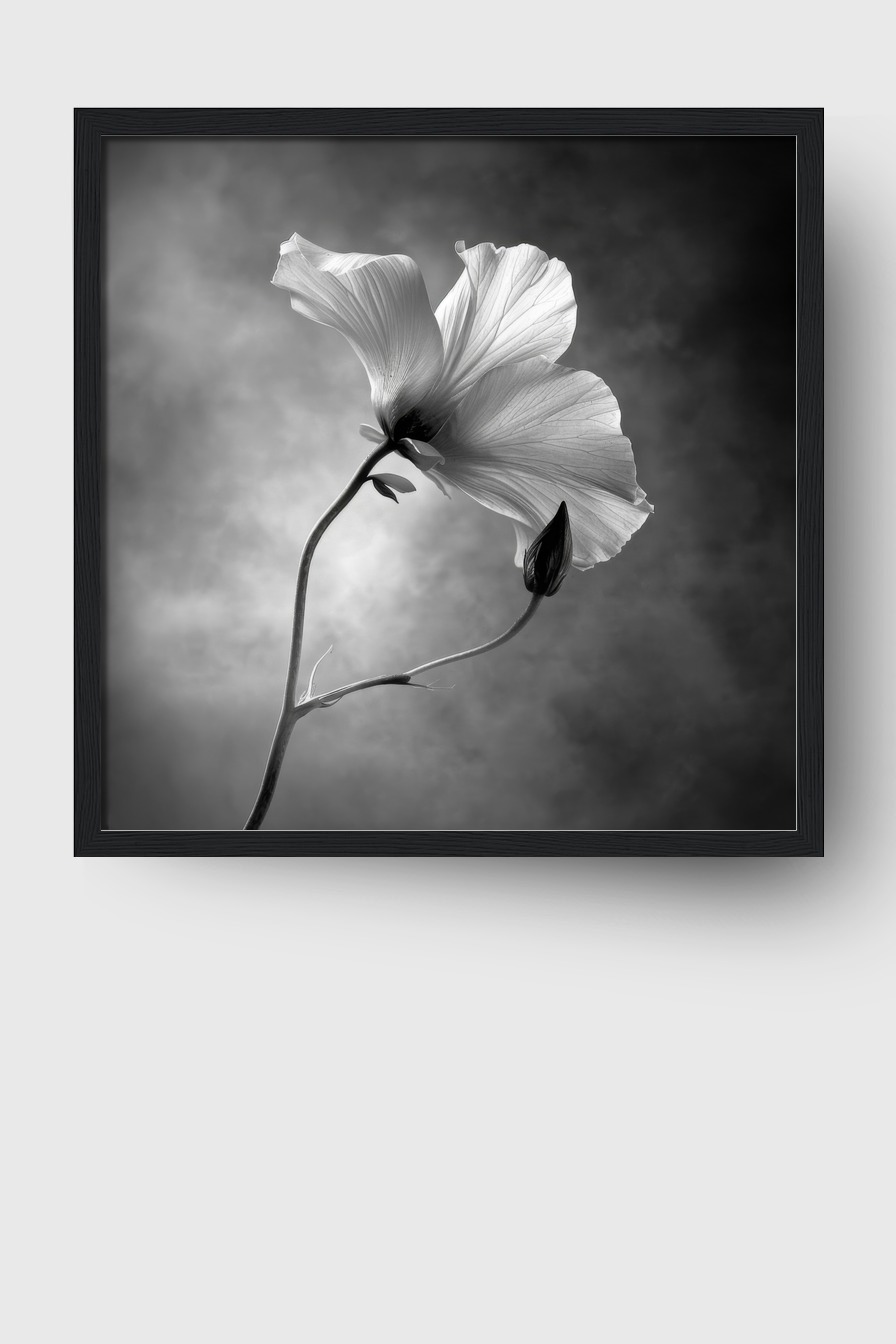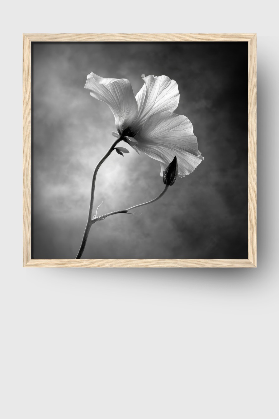 Im Raum wirkt die schwebende Blüte wie ein stiller Moment im Dunst, der den Blick auf das feine Blattwerk fokussiert.