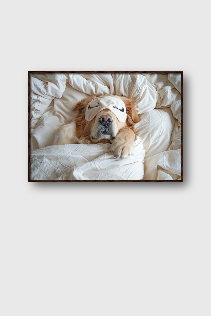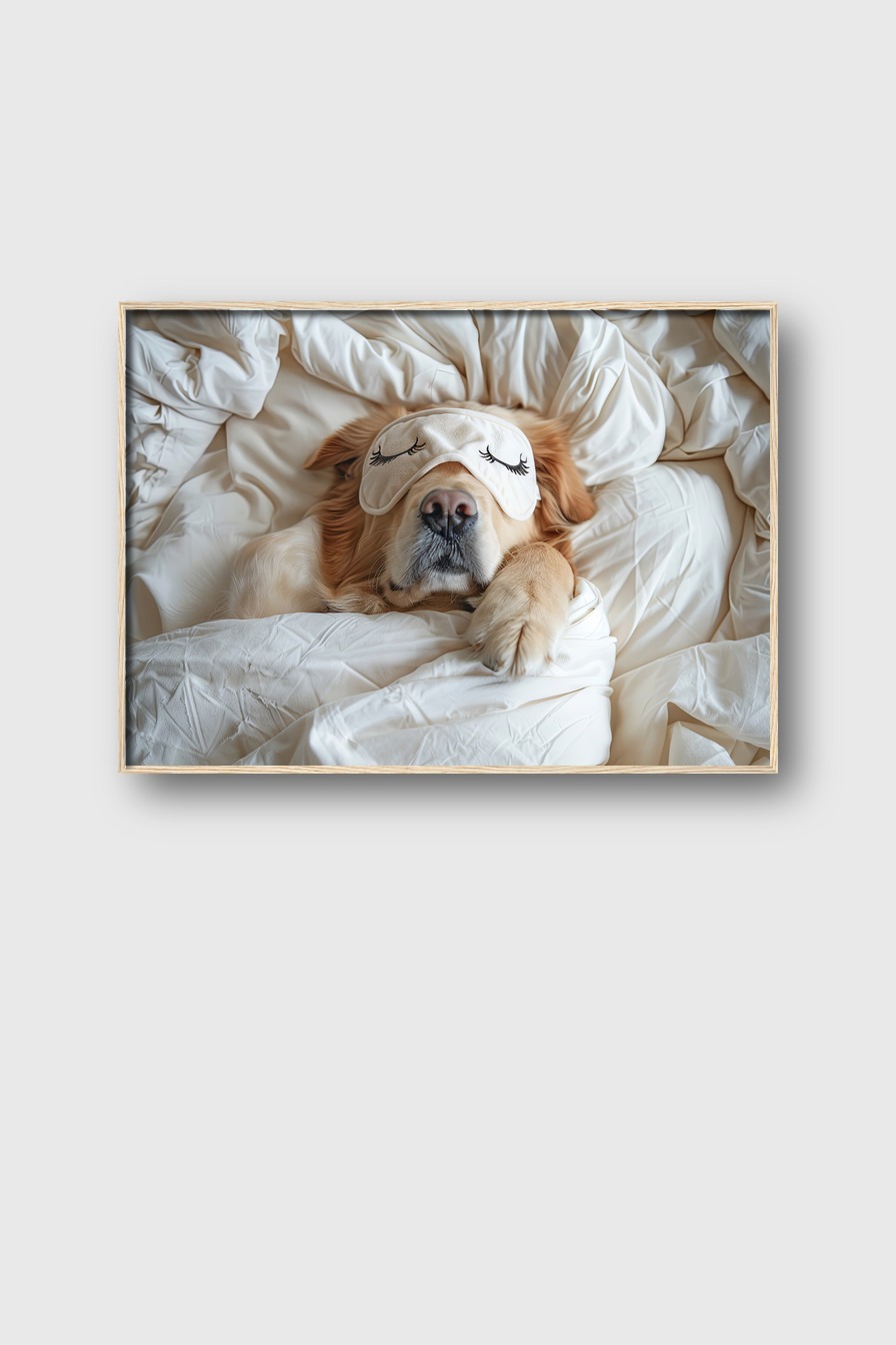 Das Bild wirkt beruhigend und gemütlich im Raum, die Schlafmaske betont die entspannten Gesichtszüge des Hundes.