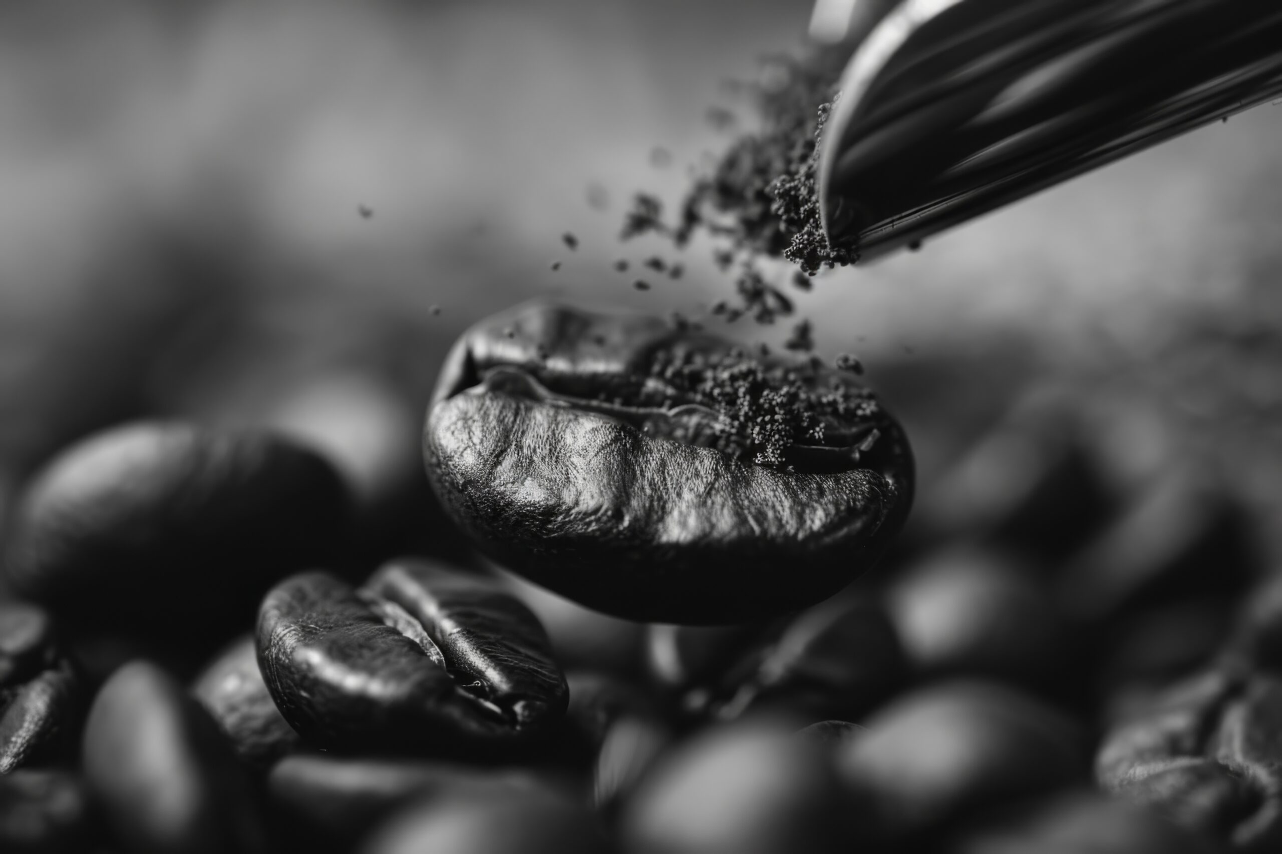Die schwarze Kaffeebohne zeigt ihre Struktur und Staubpartikel im Fokus.