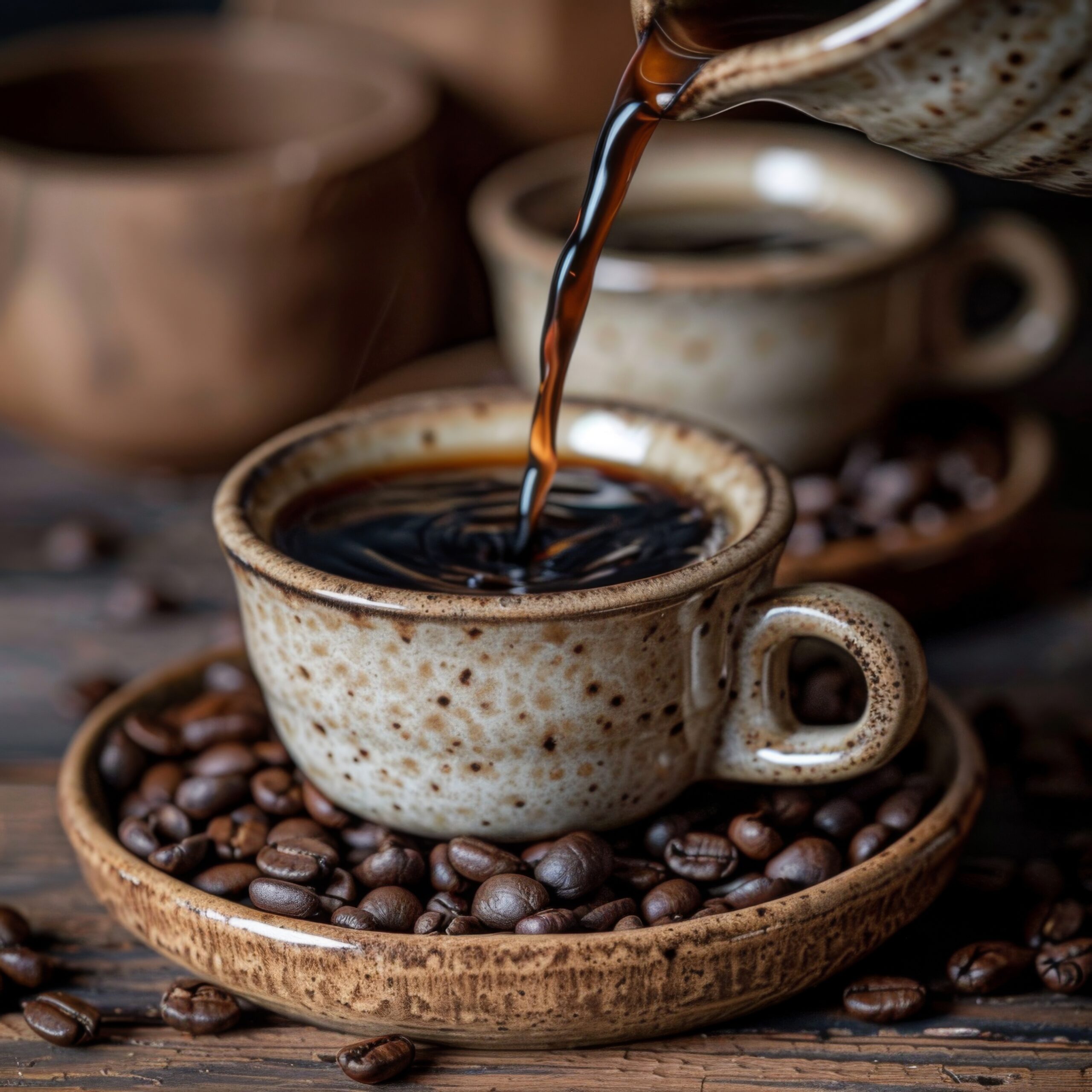 Eine warme Atmosphäre entsteht durch die Kombination rauer Keramik und den tiefen Farbton des Kaffees, der perfekt die Ruhe eines Kaffeegenusses einfängt.