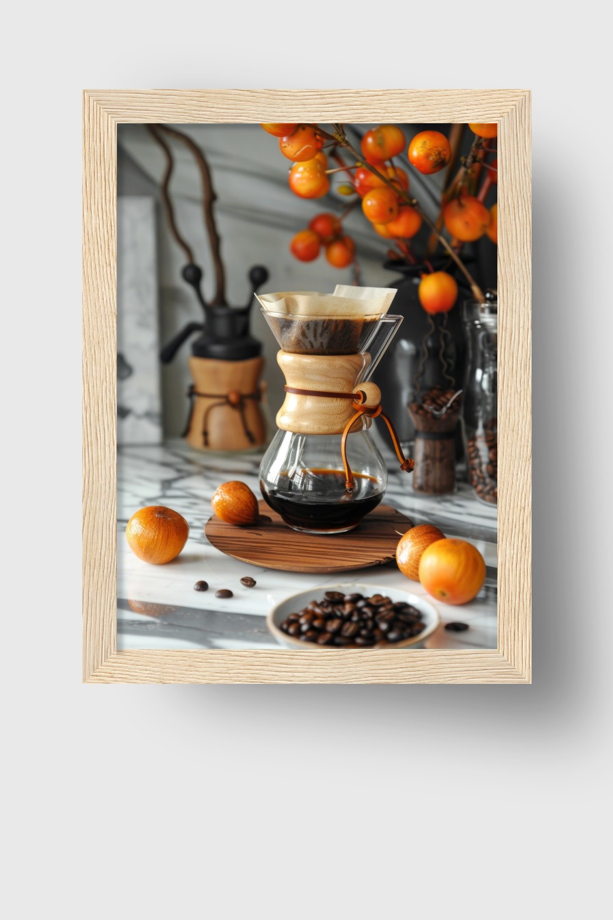 Der Kaffeezubereiter steht auf einer glatten Oberfläche, umgeben von Kaffeebohnen und orangenen Früchten, schafft eine ruhige Stimmung.
