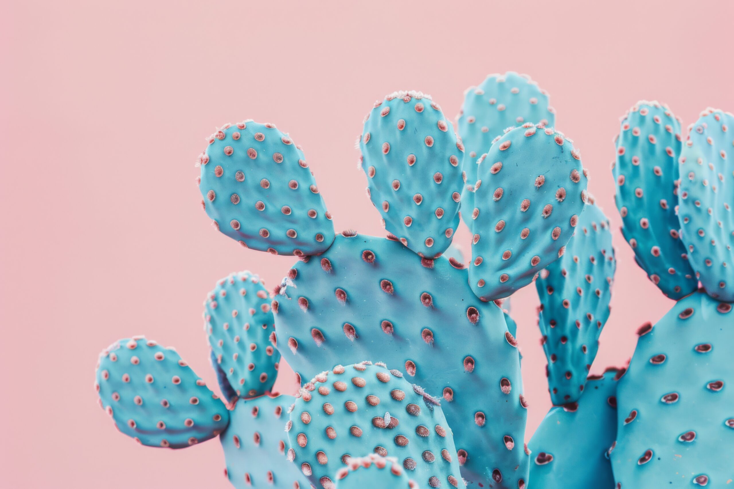 Das Bild fängt die strenge Symmetrie und das matte Blau der Kaktusblätter ein. Es wirkt kühl und reduziert, zugleich verspielt durch den zarten rosa Hintergrund.