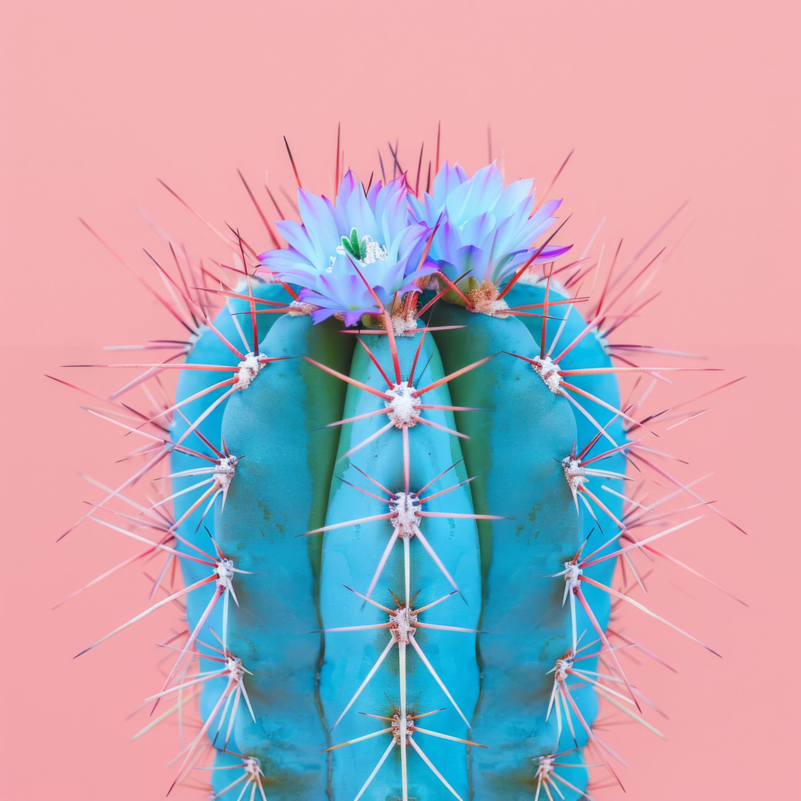 Das Motiv vermittelt durch das intensive Blau des Kaktus und die zarten lilafarbenen Blüten eine ungewöhnliche, kühle Atmosphäre.
