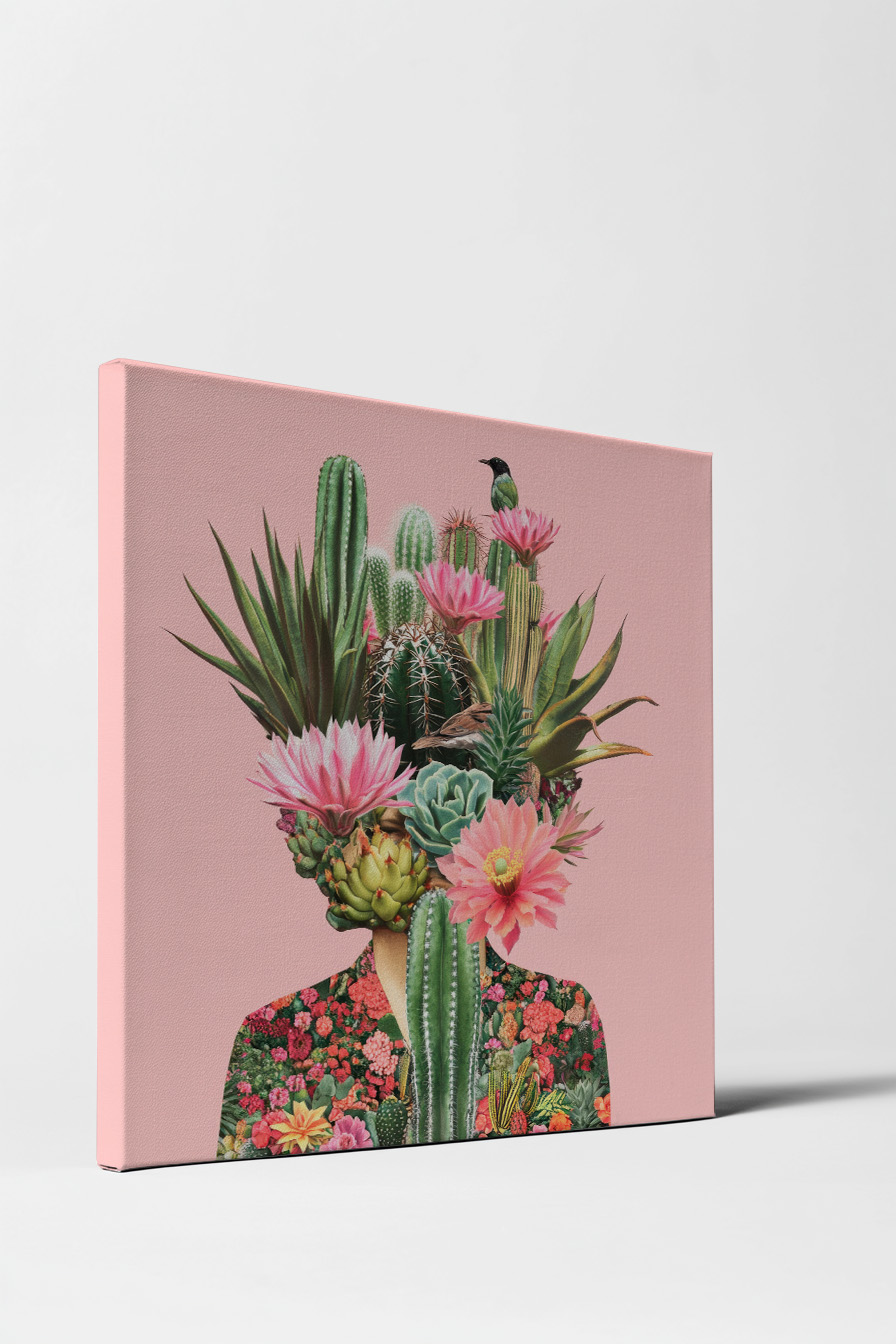 Ein Kopf geformt aus einer Vielzahl grüner Kakteen und pinken Blüten, Vögel sitzen behutsam zwischen den Pflanzen, das Bild offenbart bei längerem Hinsehen die Komplexität und Lebendigkeit der Natur