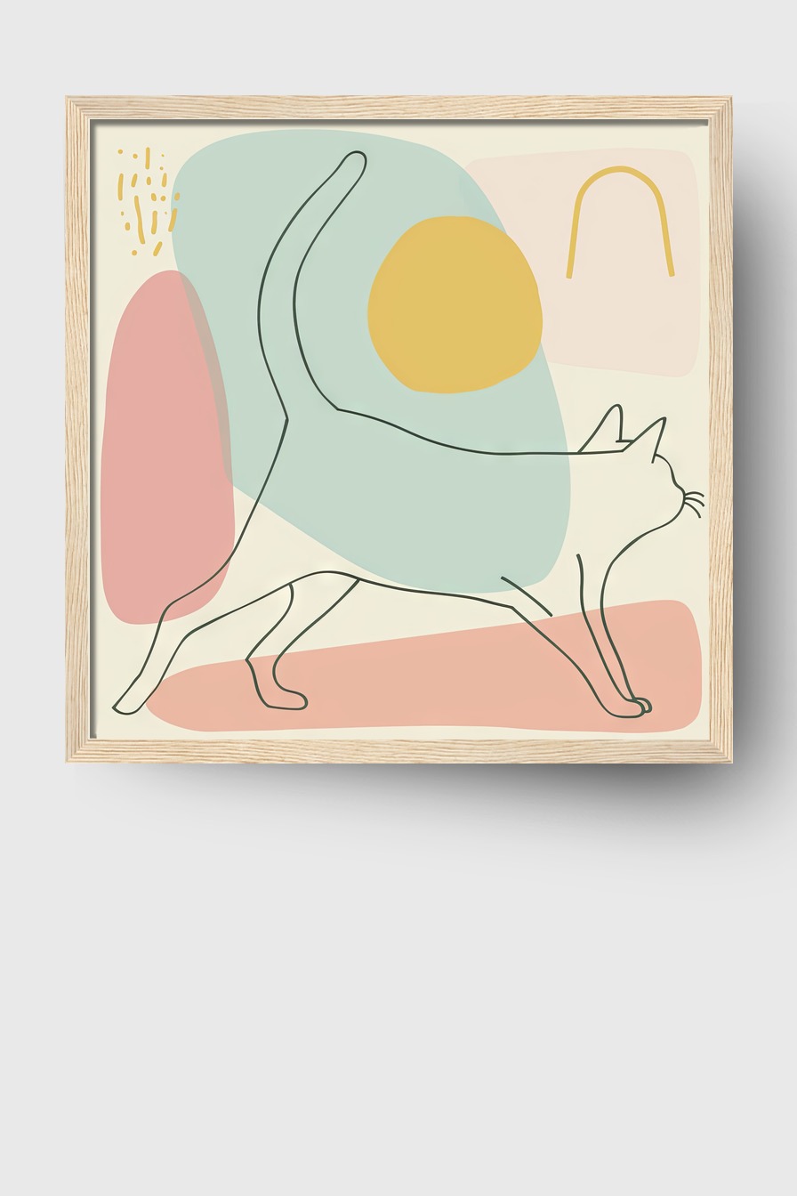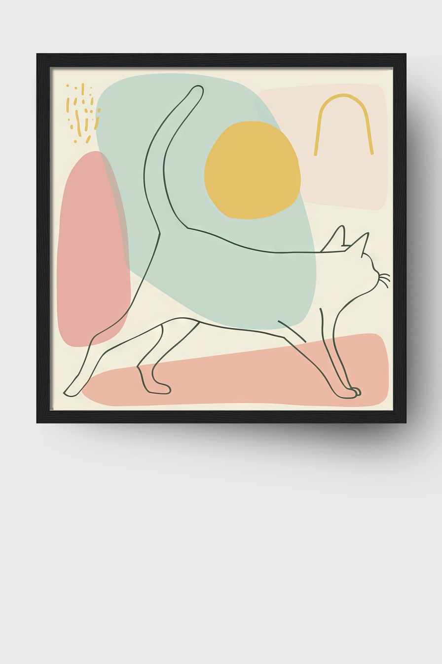 Das Motiv entfaltet seine Klarheit durch die Kombination aus prägnanter Kontur und farbigen Flächen. Im Rahmen wird die Katze zum Blickfang, der durch Farben und Formharmonie klare Akzente setzt.