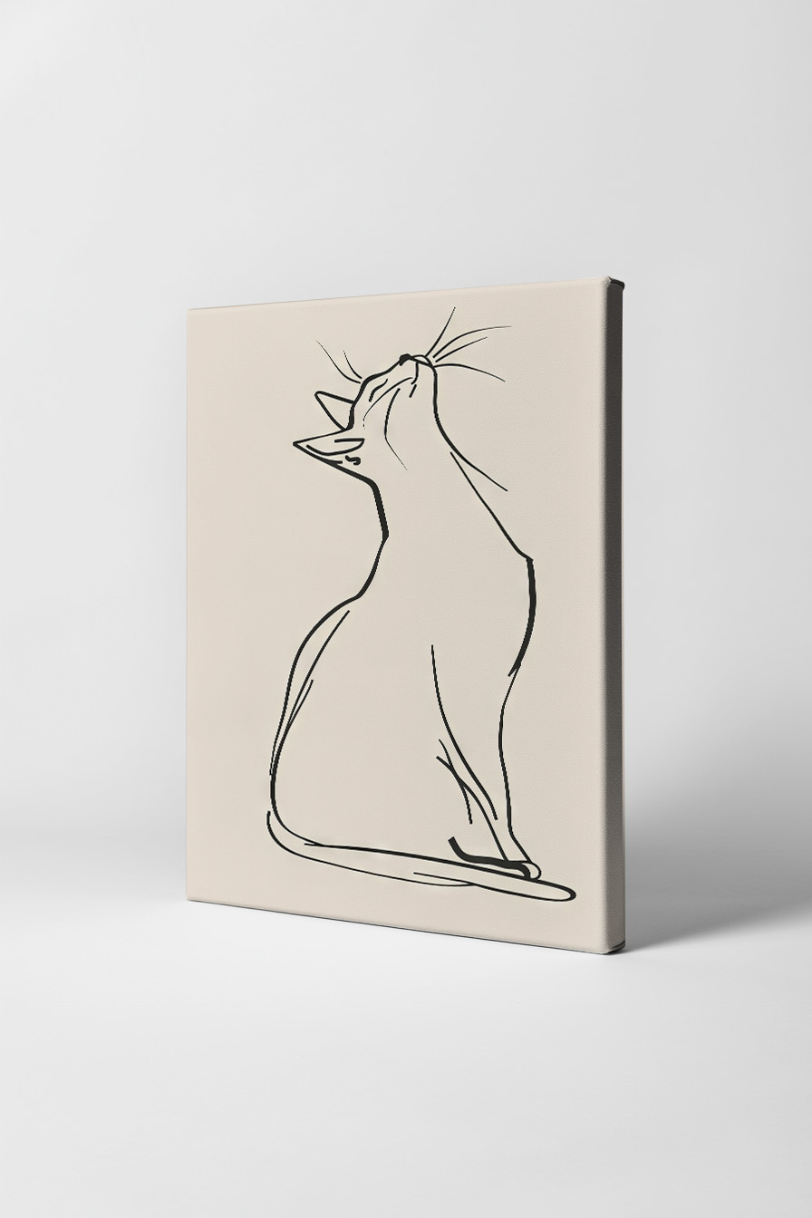 Das Motiv zeigt die Katze als schlichte, fließende Kontur, die durch den minimalistischen Stil Ruhe vermittelt. Die Zurückhaltung der Linien lässt viel Raum für Interpretation und Konzentration auf die Form.