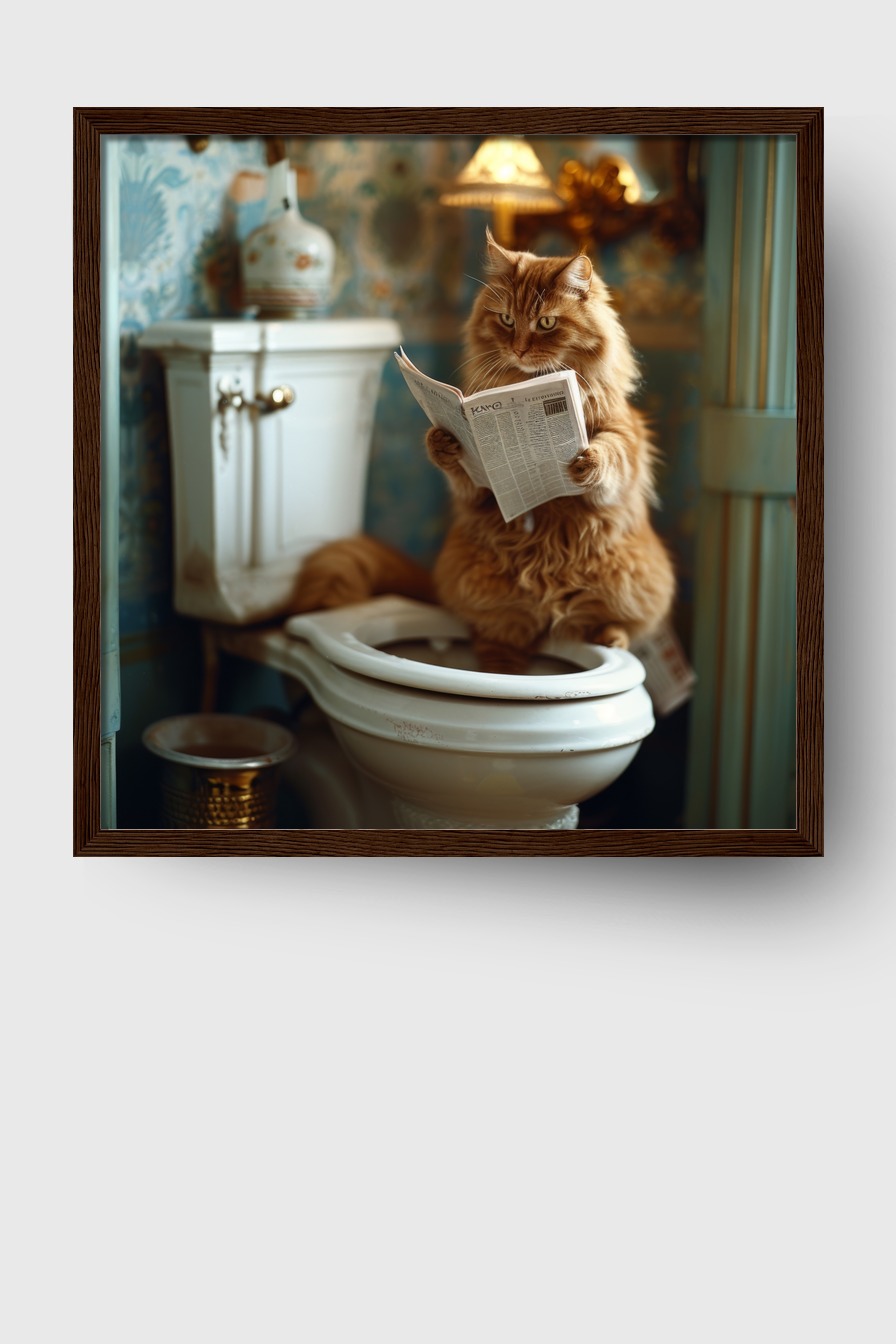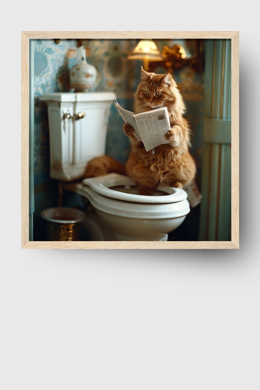 Eine ruhige Szene mit einer Katze auf der Toilette, vertieft in eine Zeitung. Poster (170 g/m², halbmatt) hinter Plexiglas, im FSC-zertifizierten Kiefernholzrahmen. Erhältlich in Schwarz, Weiß, Naturholz und Dunkelbraun. Fertig zum Aufhängen mit inklusive Aufhängeset.