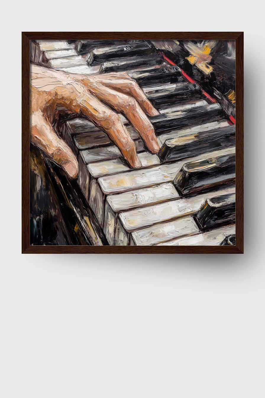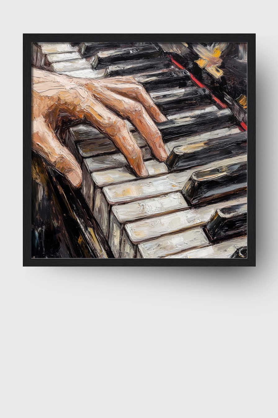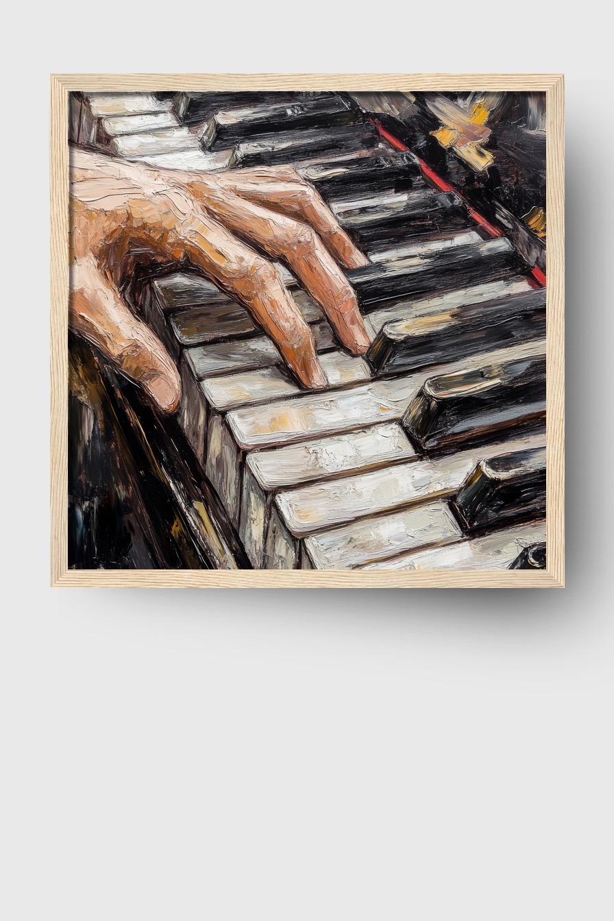 Im Raum zieht das Detail der Hände die Blicke auf sich und vermittelt intime Nähe zur Musik. Das Motiv wirkt lebendig und bringt Rhythmus und Struktur in die Umgebung, ideal für Orte mit kreativem Flair.